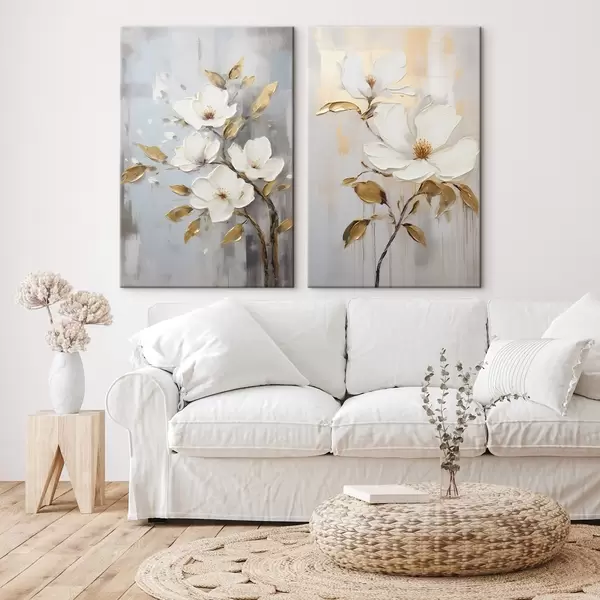 Paveikslas Dvi baltos gėlės su geltonai oranžiniais lapais šviesiame fone Nr m00687
