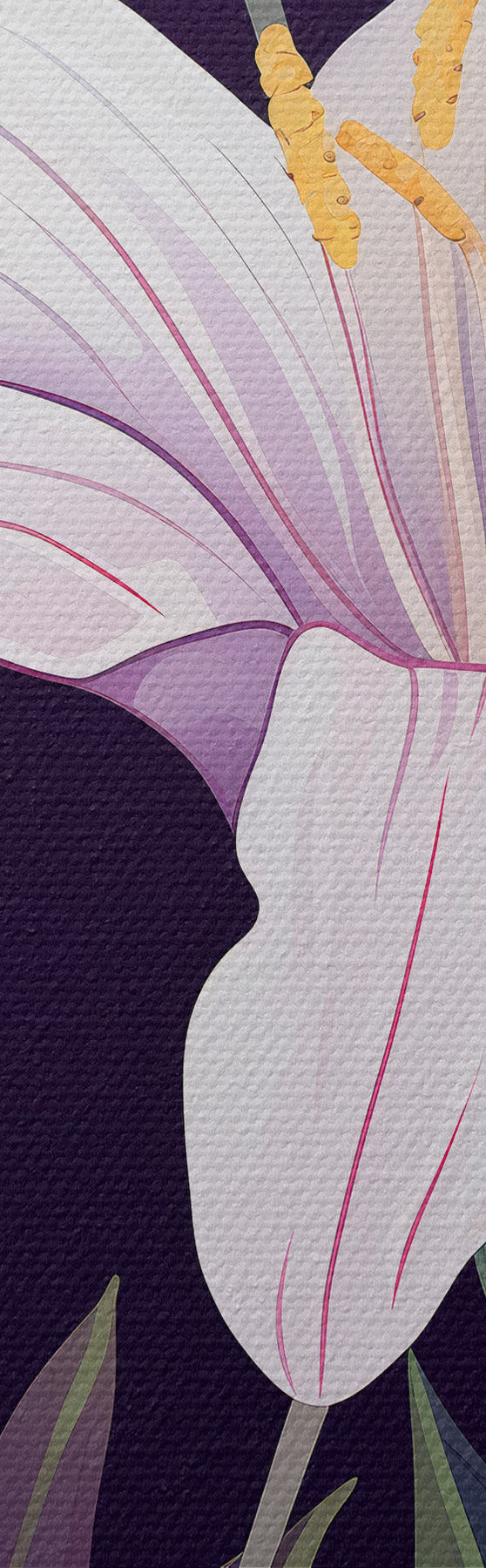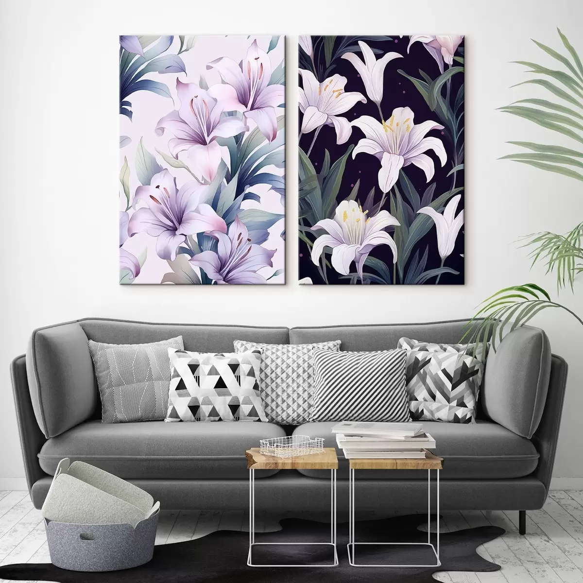 Paveikslas Švelnios rožinės lelijos su žaliais lapais šviesiame ir tamsiame fone Nr m00689