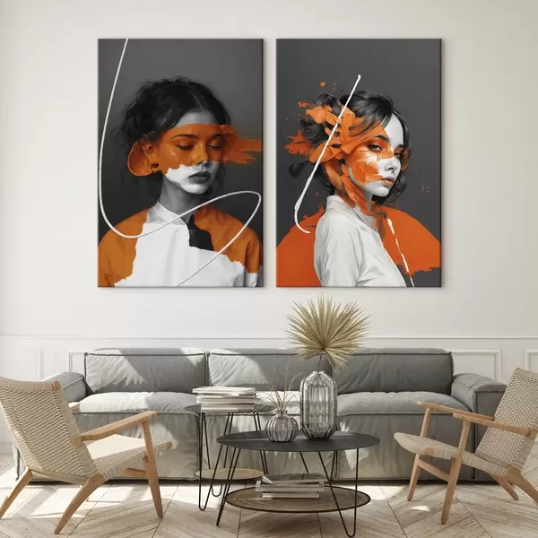 Paveikslas Mergaičių portretai su abstrakčiais oranžiniais potėpiais Nr m00693