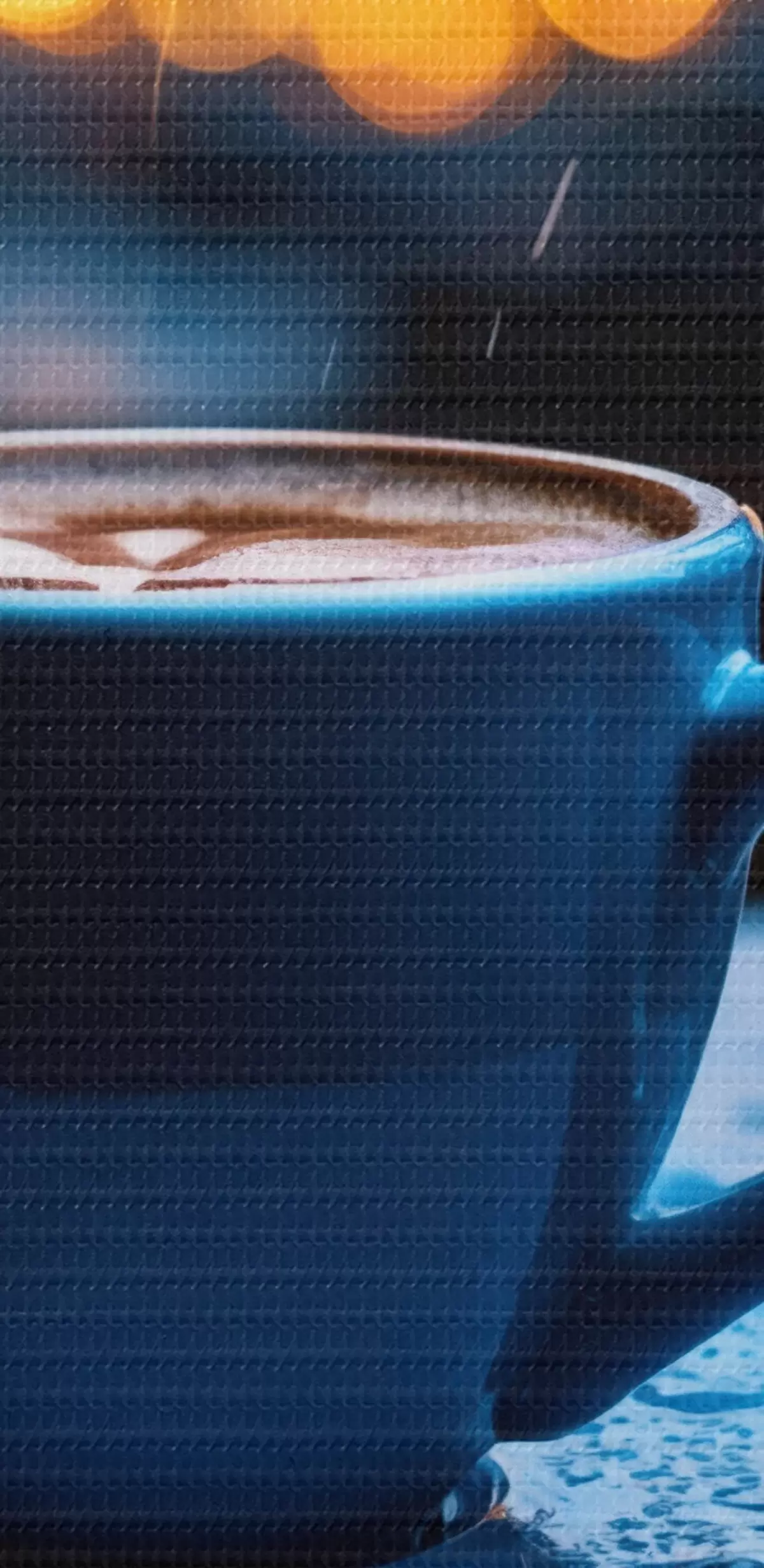 Paveikslas Mėlynos gėlės su vandens lašais ir puodeliu kavos per lietų Nr m00694