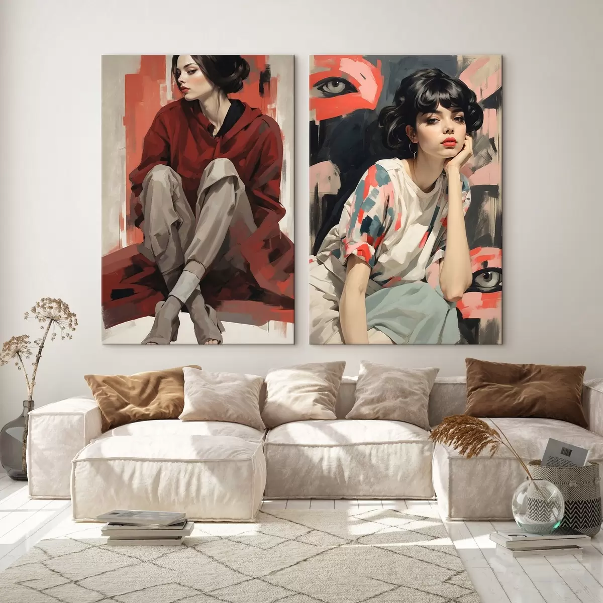 Paveikslas Raudonos ir smėlio spalvos abstrakčių stilių mergaičių portretai Nr m00695