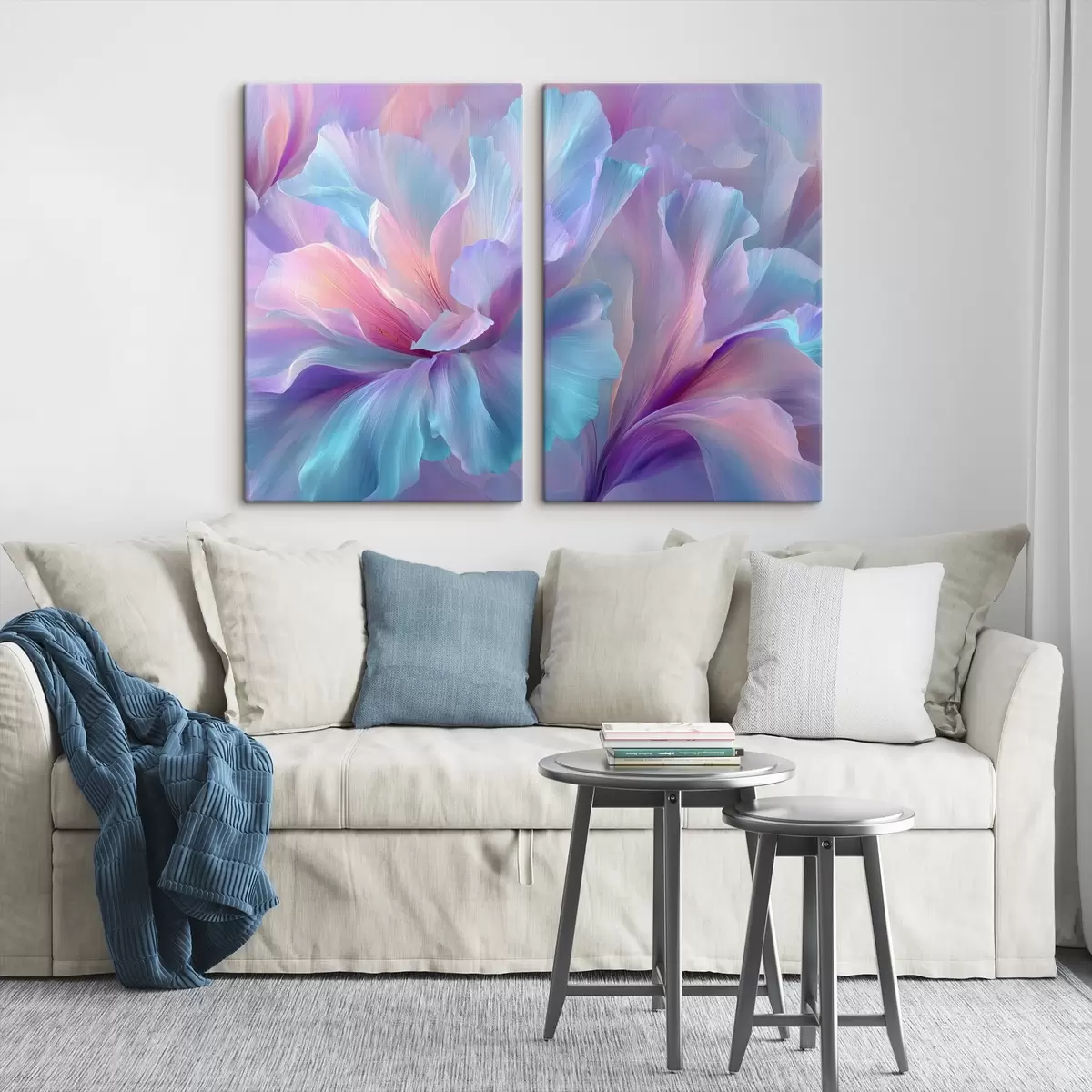 Paveikslas subtilus fantazijos gėlių su žiedlapiais violetinės, mėlynos ir rožinės spalvos atspalviais. Nr m00700