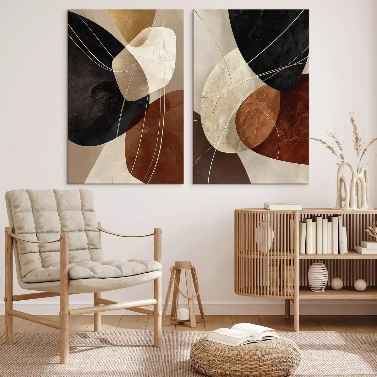 Paveikslas Geometriniai ovalai šiltų spalvų paletėje su geltonomis linijomis Nr m00763