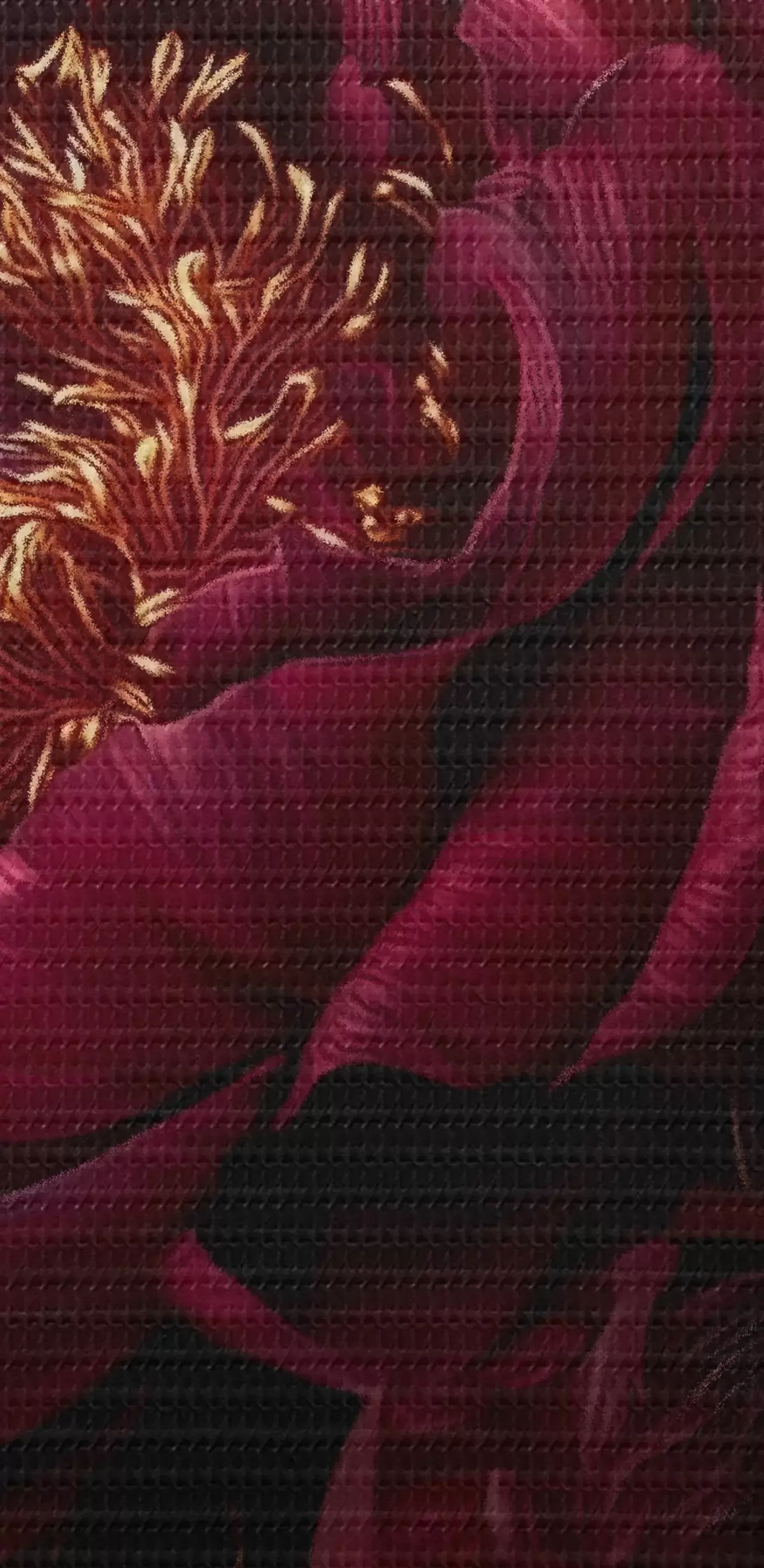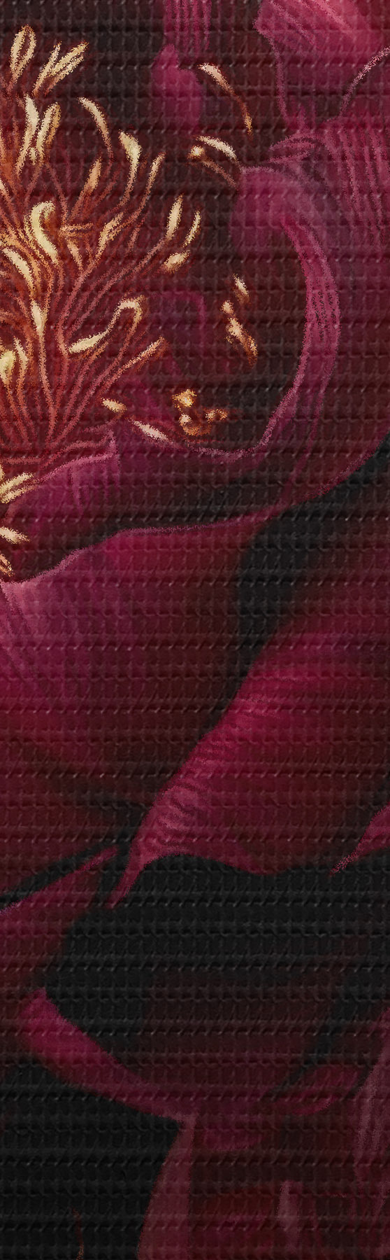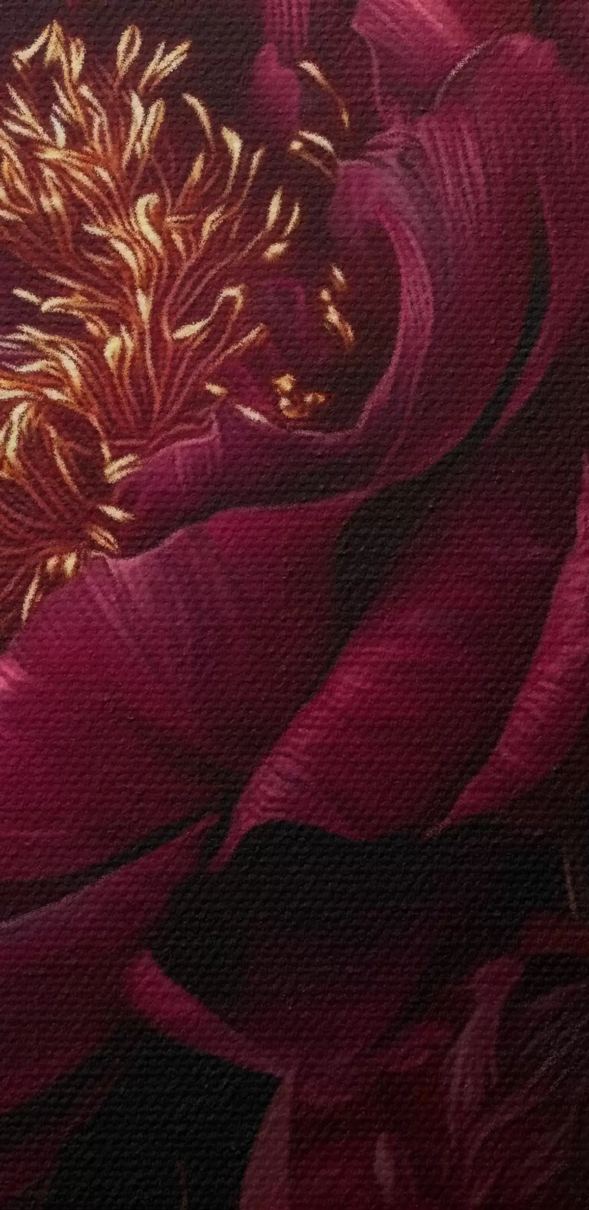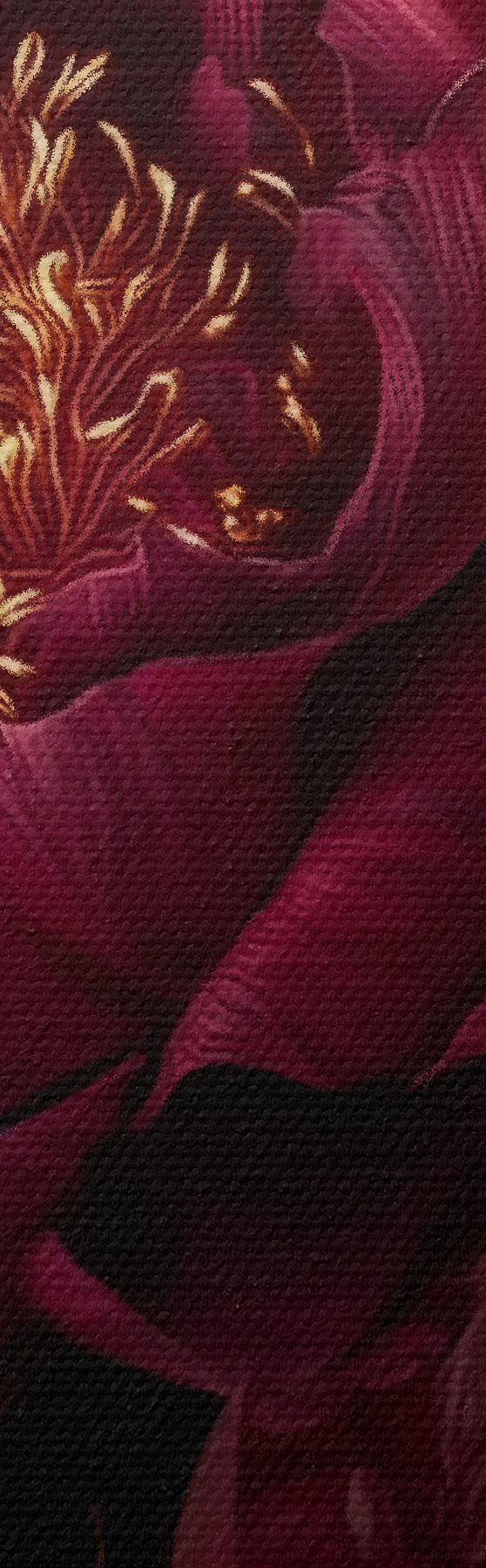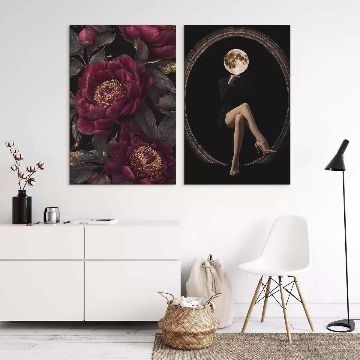 Paveikslas Bordo spalvos bijūnai ir mėnulio formos siluetas ant juodo fono Nr m00765