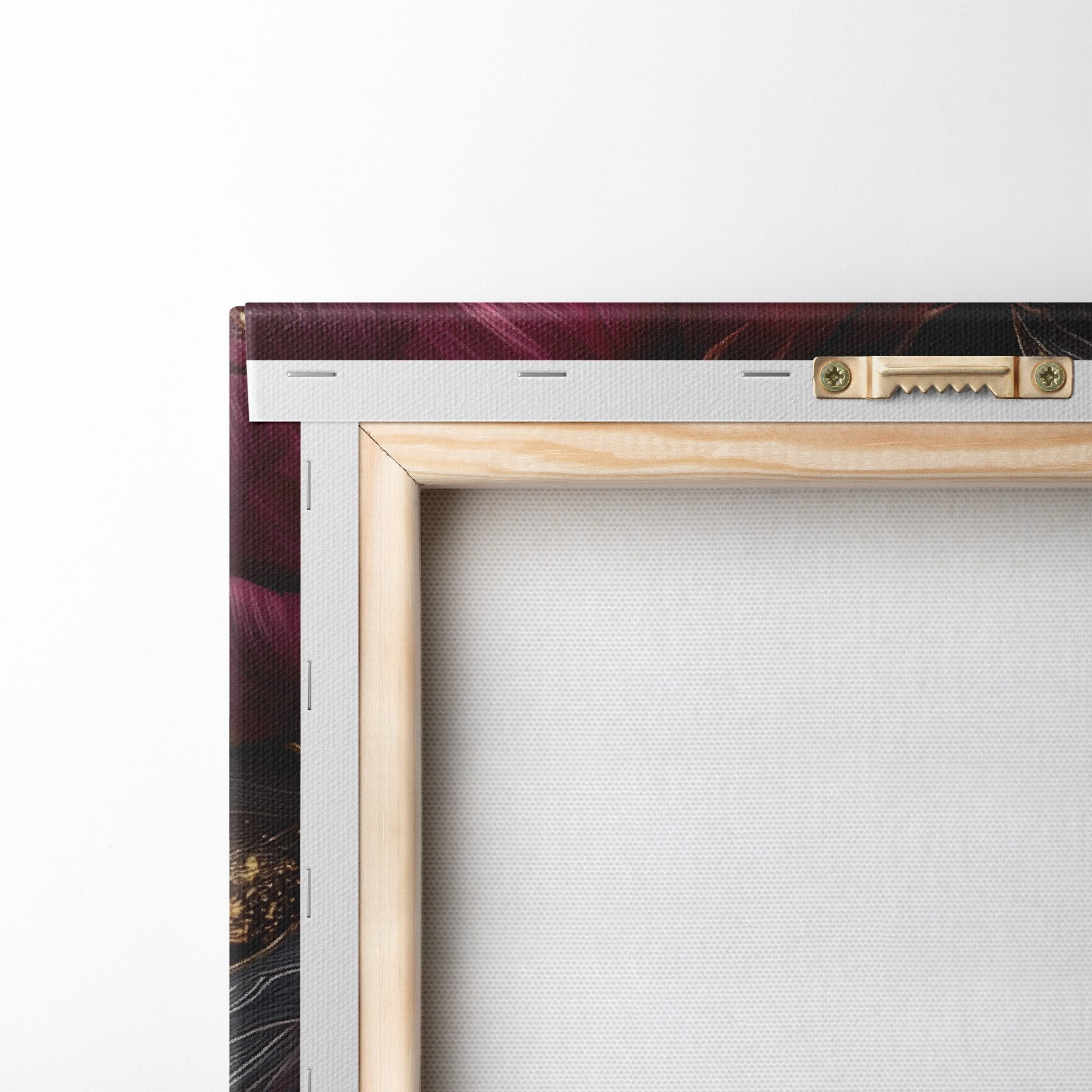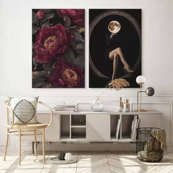 Paveikslas Bordo spalvos bijūnai ir mėnulio formos siluetas ant juodo fono Nr m00765