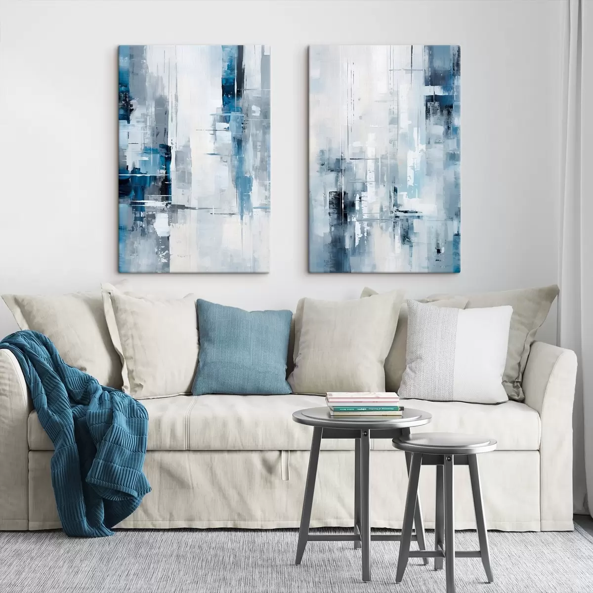 Paveikslas Abstraktaus tapybos imitacija mėlyna, pilka ir balta spalvomis, vertikaliomis linijomis ir geometrinėmis formomis Nr m00819