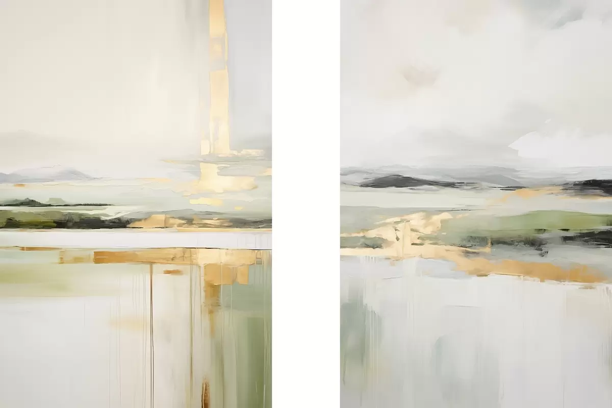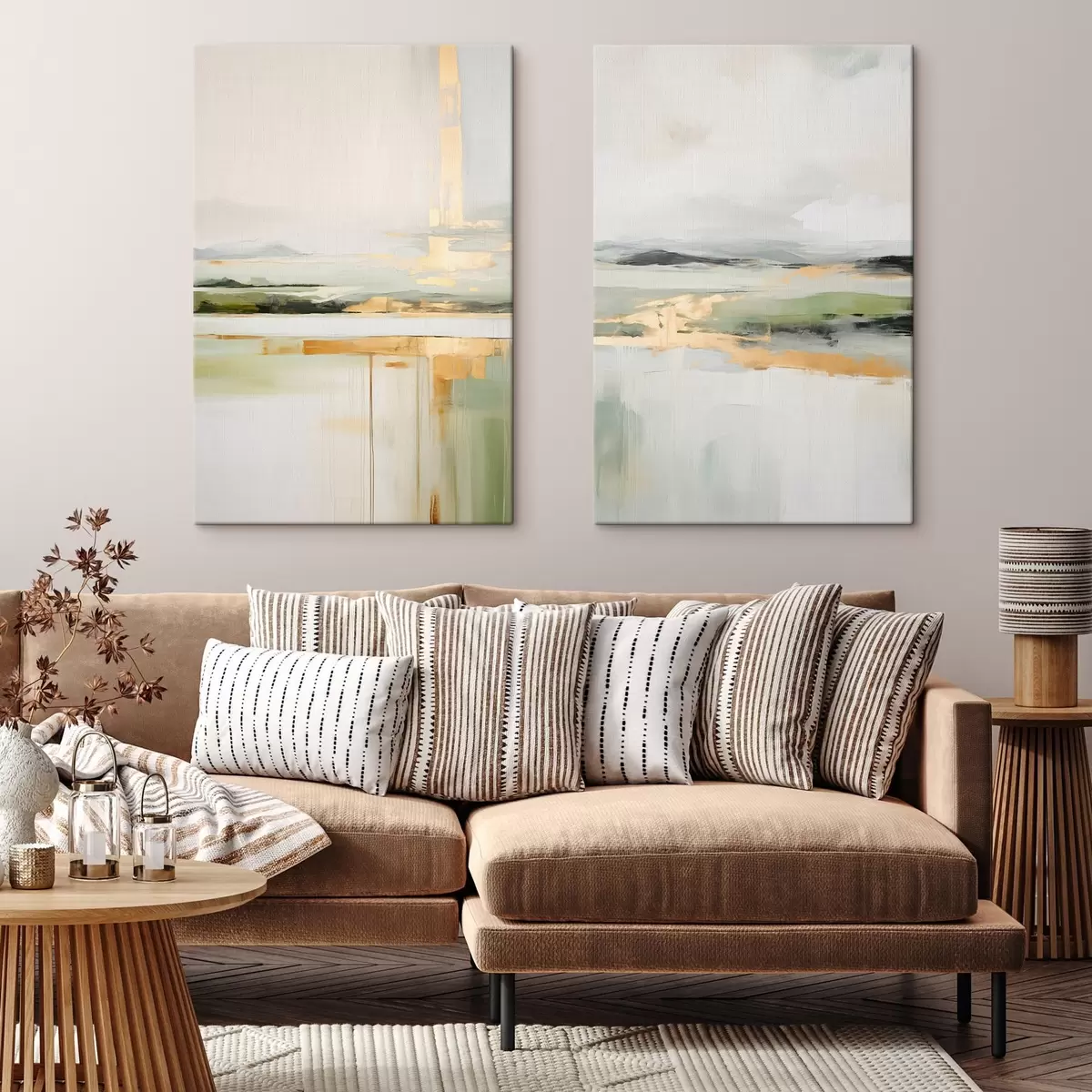 Paveikslas Abstraktus peizažas su geltonais akcentais, minimalistinė žemės, vandens ir dangaus kompozicija, su prislopintomis spalvomis. Nr m00877