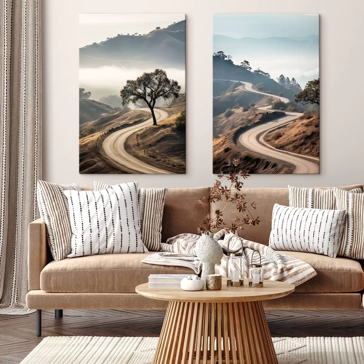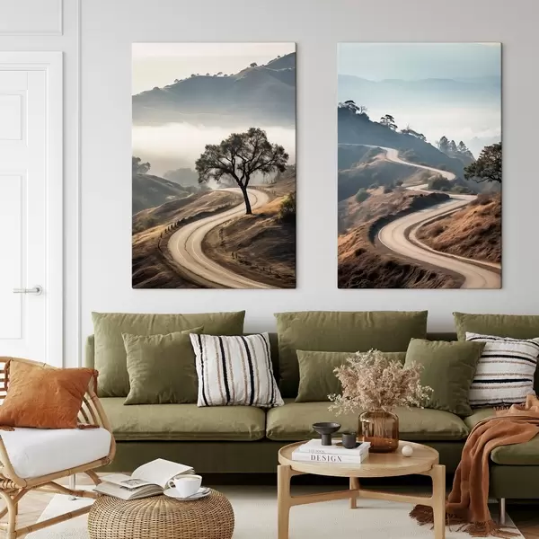 Paveikslas Vingiuotas kelias per kalvotą kraštovaizdį su sausa žole po giedru dangumi ir toli matomomis kalnų viršūnėmis. Nr m00887