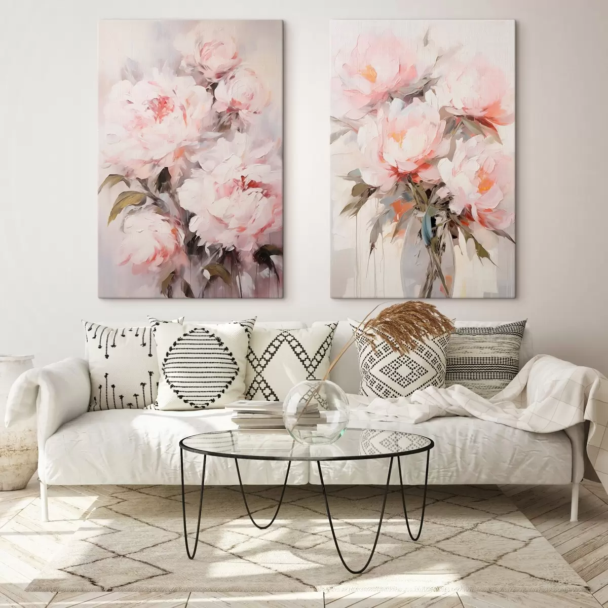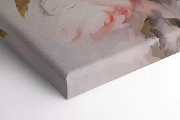 Paveikslas Šviesiai rožinių bijūnų puokštė su žaliais lapais, švelniais potėpiais, pastelinėmis spalvomis, šviesiu fonu Nr m00890