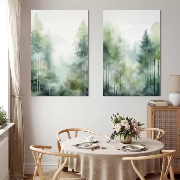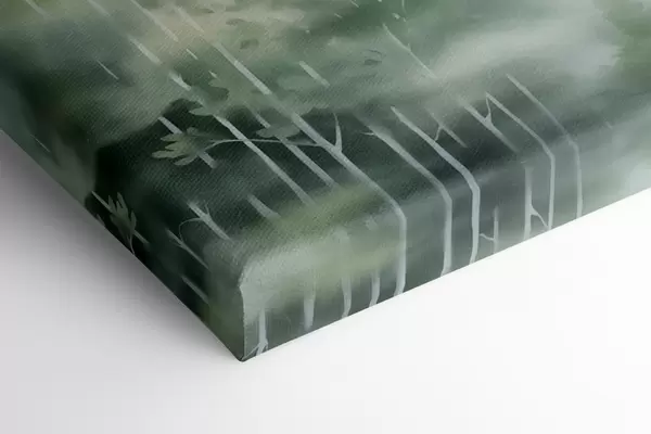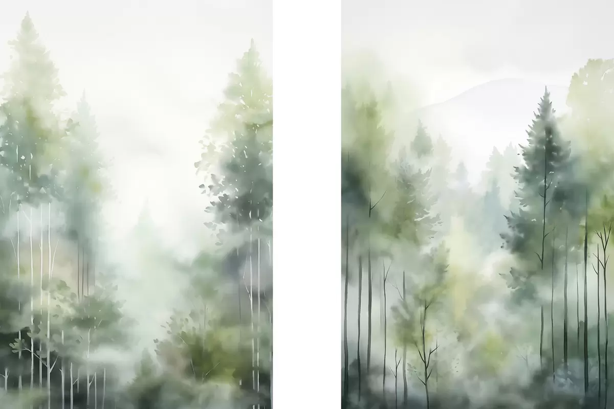 Paveikslas Akvarelės tapybos imitacija abstraktaus miško su aukštais medžiais ir žaliais lapais, švelniomis prislopintomis spalvomis Nr m01005