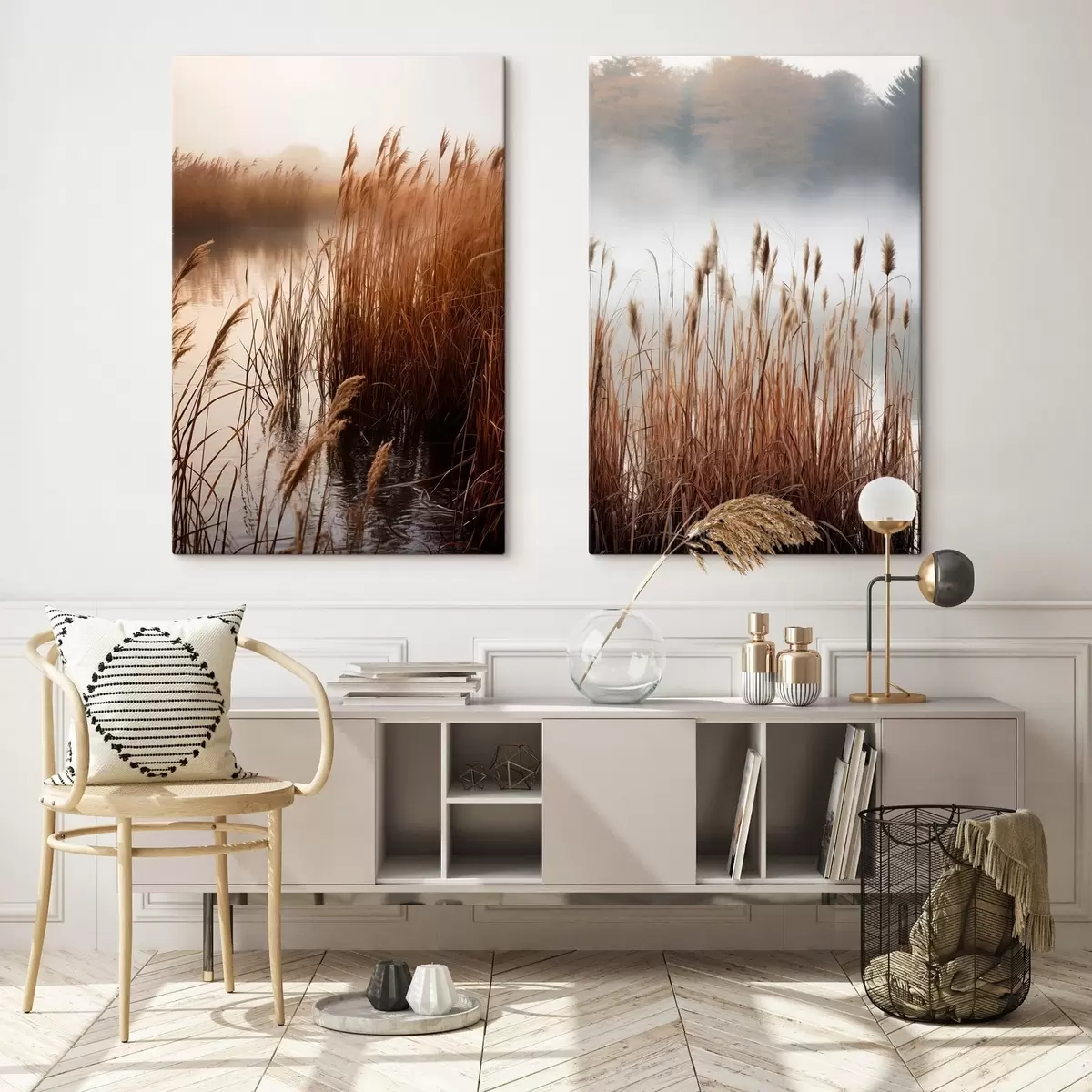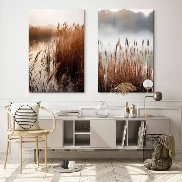 Paveikslas Aukšti nendrės, augančios vandens telkinyje, vanduo atspindi nendres, rūko apgaubtas fonas, švelni šviesa, gamtos vaizdas Nr m01008
