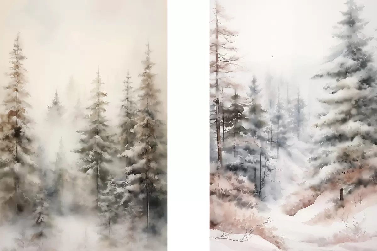 Paveikslas Aukštos pušys, padengtos sniegu, stovinčios rūko apgaubtame miške, švelnus, tylus žiemos peizažas. Nr m01011