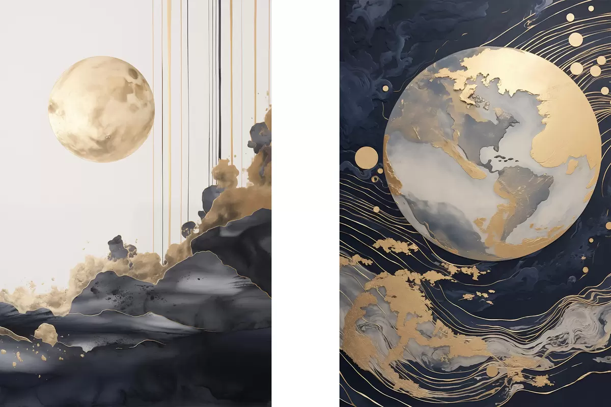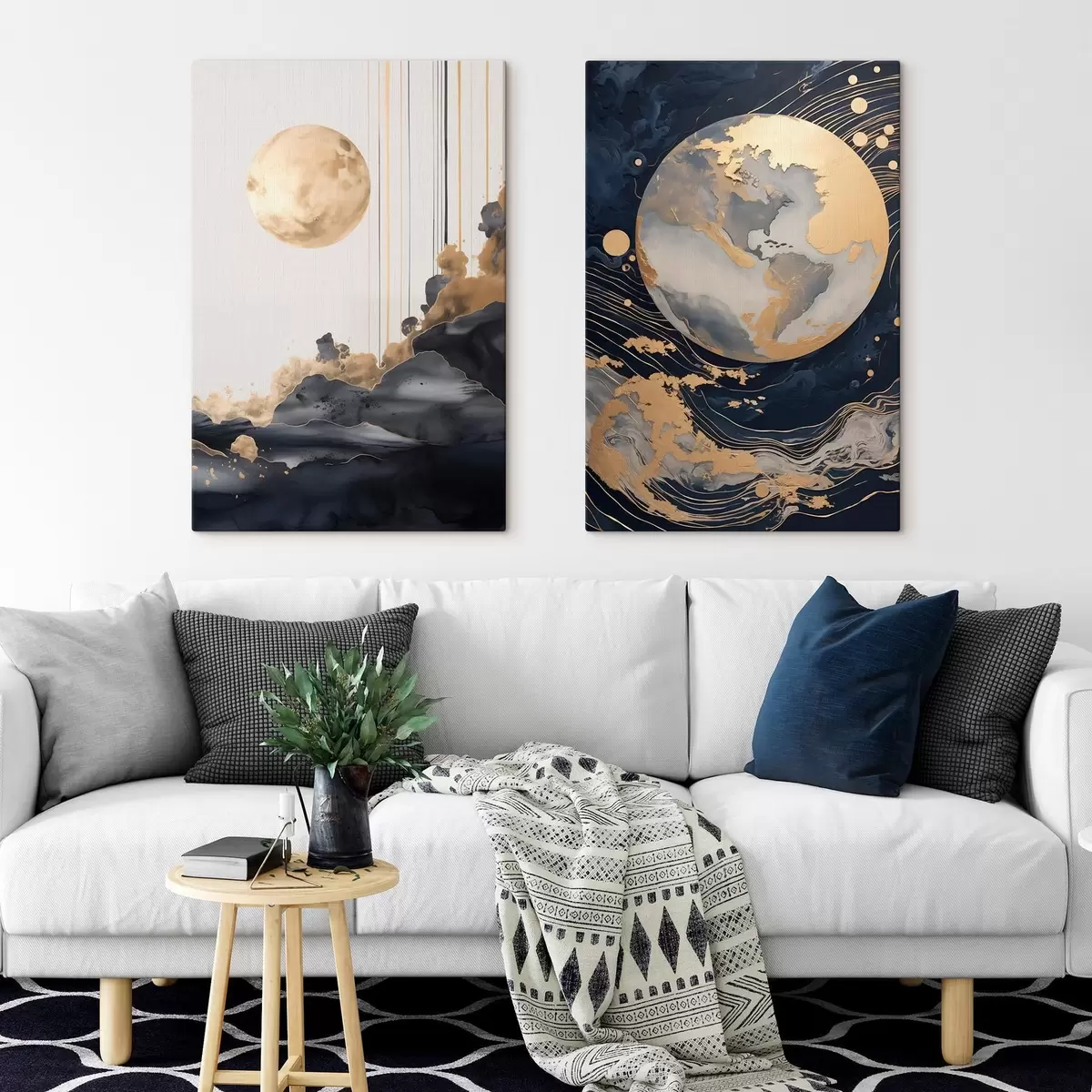 Paveikslas Tekstūruota dekoratyvinė planeta kosmose su geltonomis linijomis ir taškais, abstraktus stilius, minimalistinis ir modernus Nr m01014