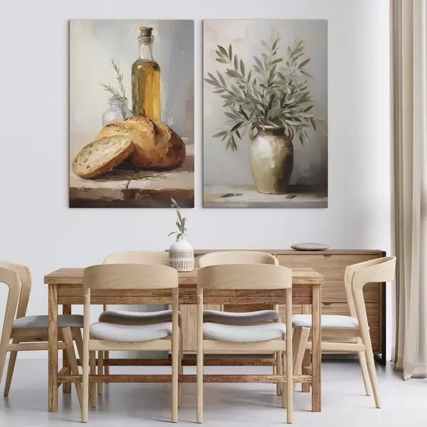 Paveikslas Alyvų šakos vazoje, duona ir aliejaus butelis, imitacijos tapyba Nr m01035
