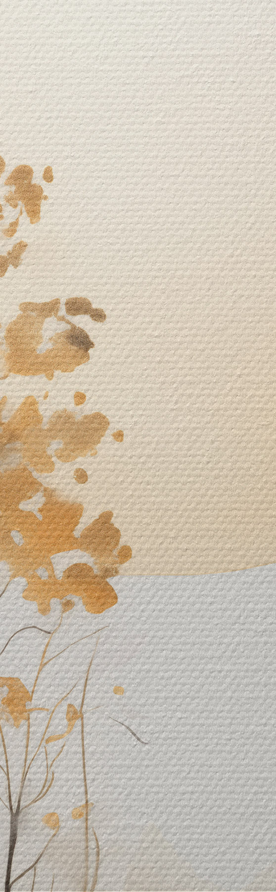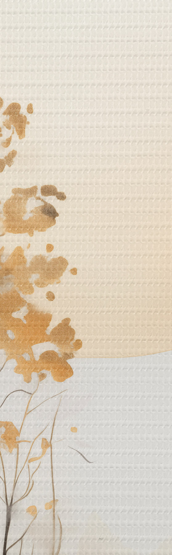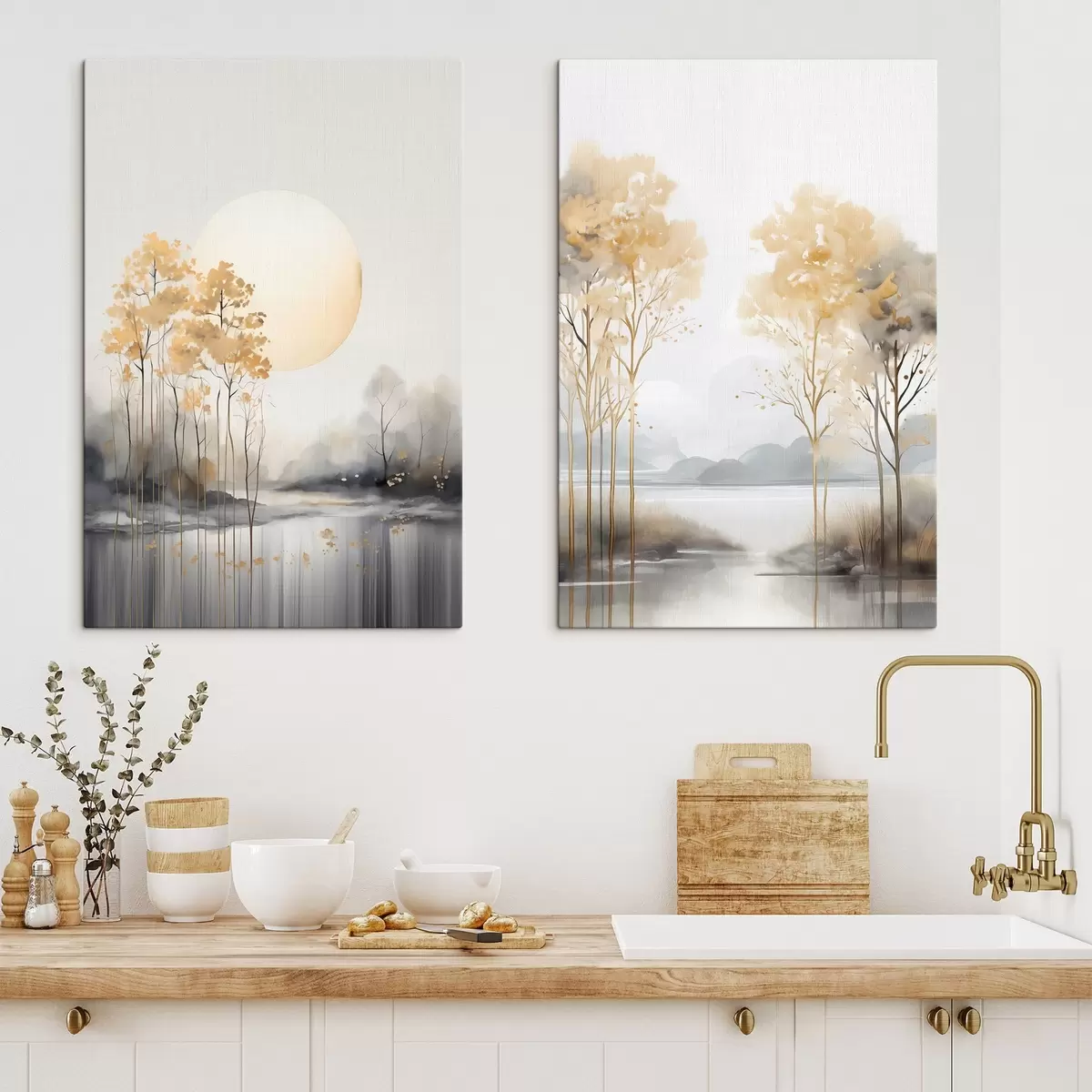 Paveikslas Dekoratyvus abstraktus peizažas, aukšti medžiai su geltonais lapais, upė ir rūkas fone Nr m01115
