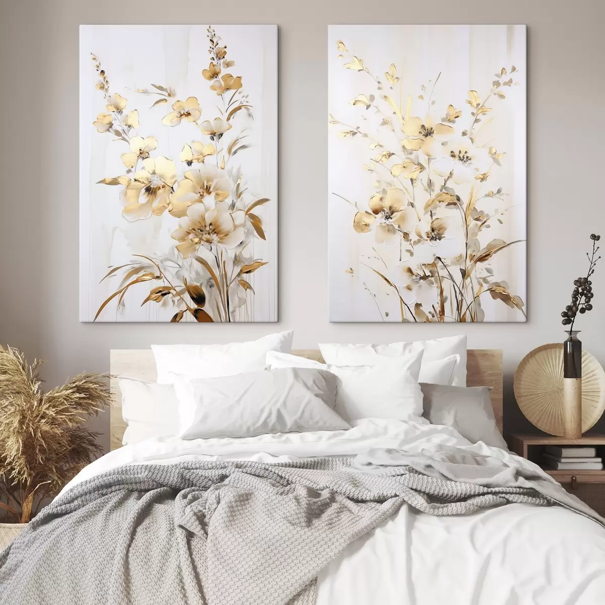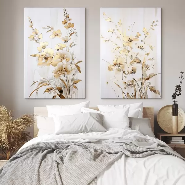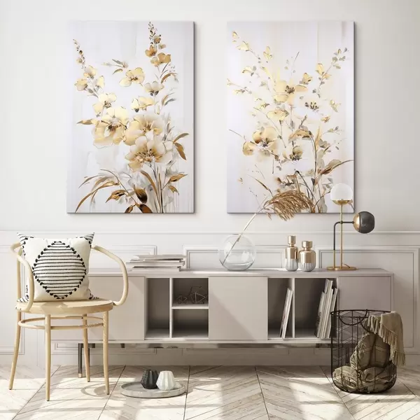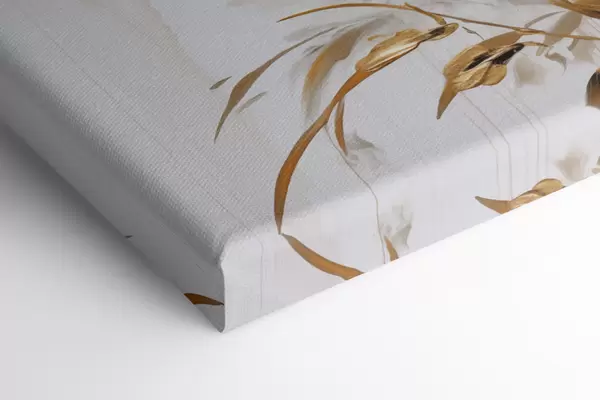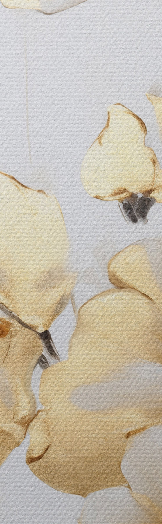 Paveikslas Tekstūruoti geltoni žiedai ir lapai ant balto fono, su subtiliais potėpiais Nr m01116