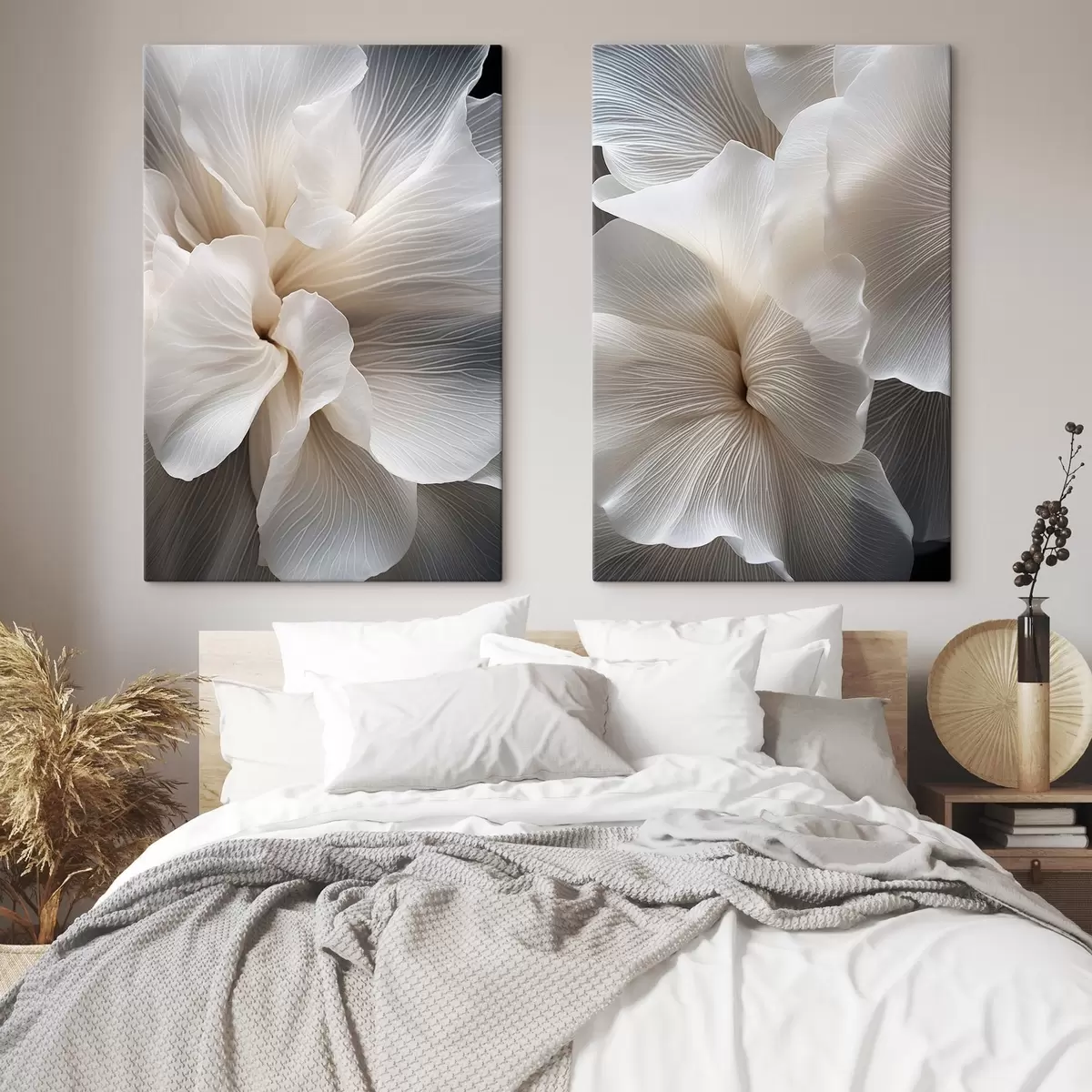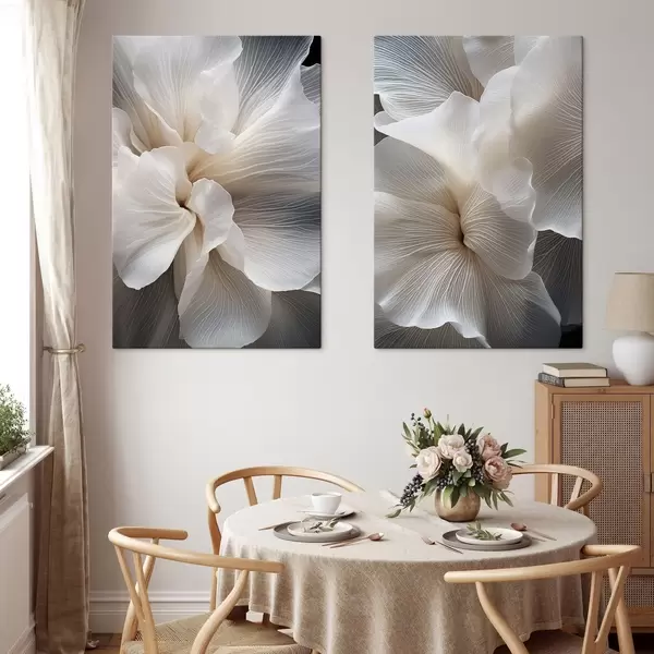 Paveikslas Artimas vaizdas subtilaus abstraktaus balto gėlių žiedo su sudėtingomis linijomis ir neryškiu tamsiu fonu Nr m01117