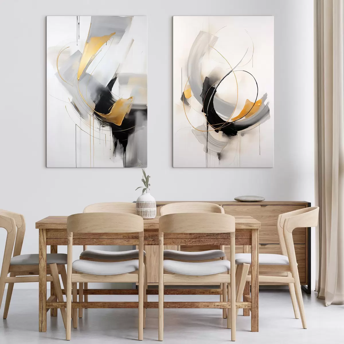Paveikslas Abstraktaus tapybos kūrinys su geltonos, juodos ir baltos spalvų potėpiais, dinamiškomis linijomis. Nr m01125