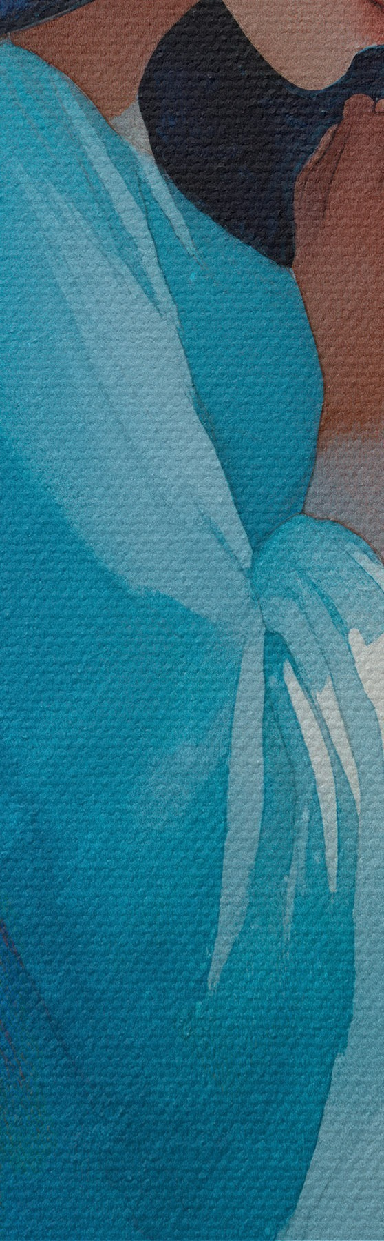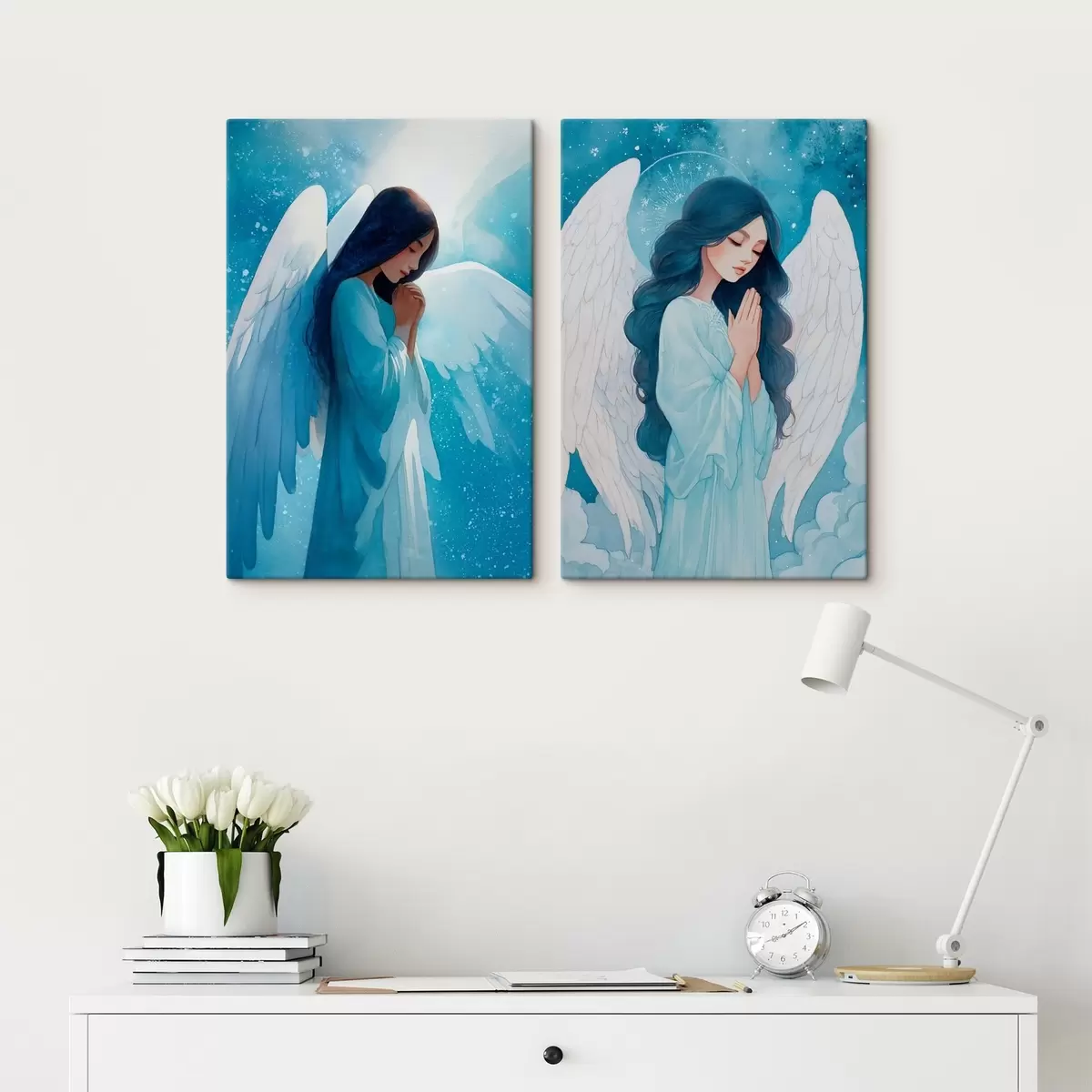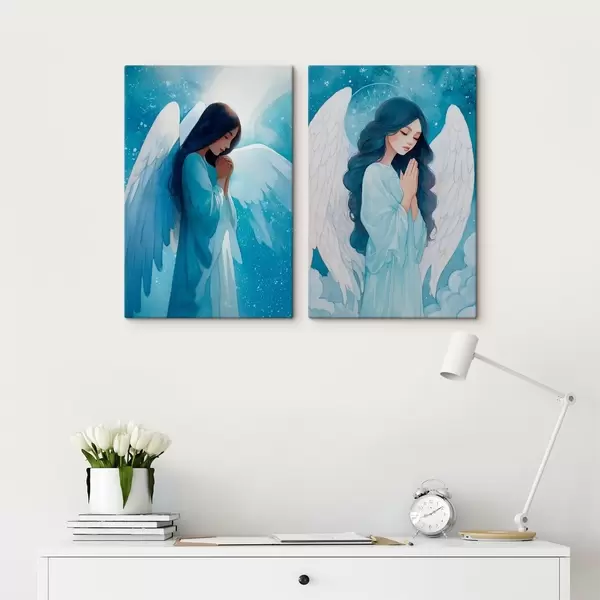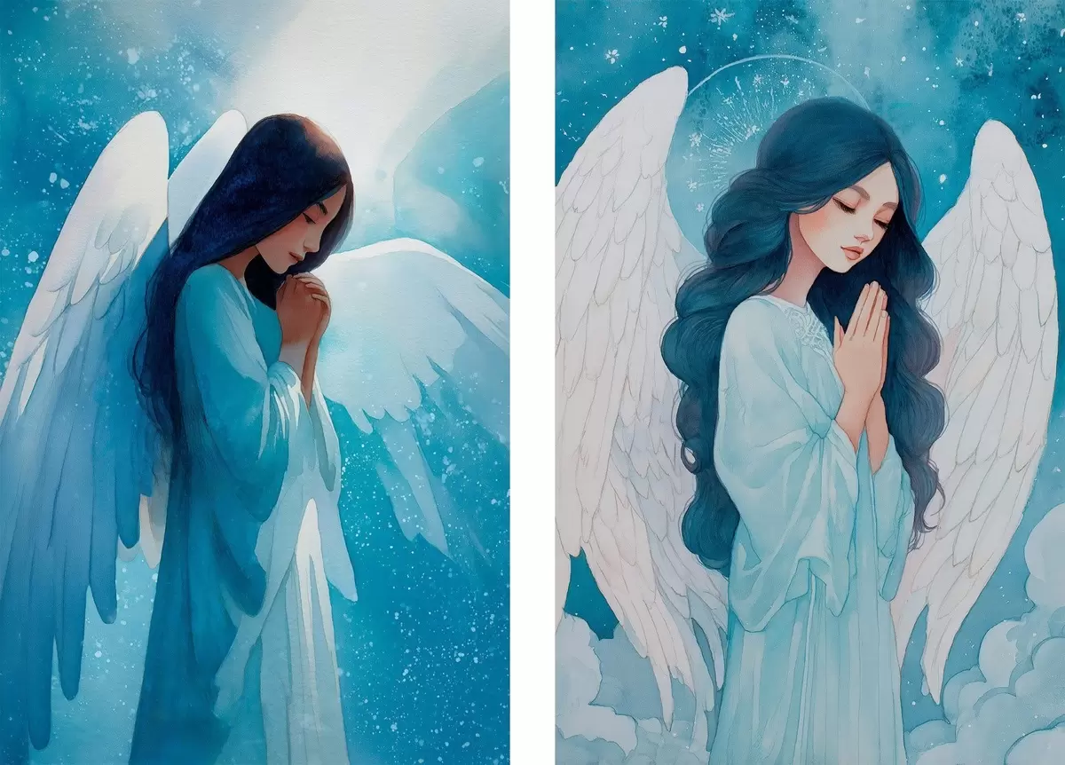 Paveikslas Šiuolaikinis sakralinis menas akvarelės stiliumi su mėlynomis mantijomis apsirengusio angelo sargo atvaizdu Nr m01153