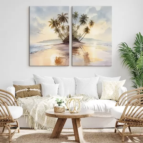 Paveikslas akvarelės stiliaus saulėlydžio paplūdimys saloje Nr m01177