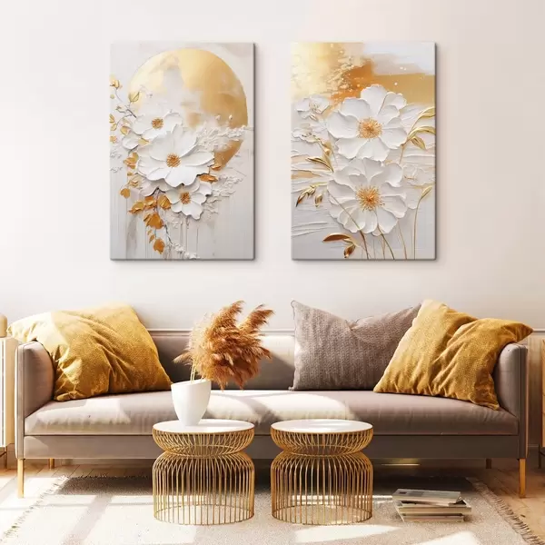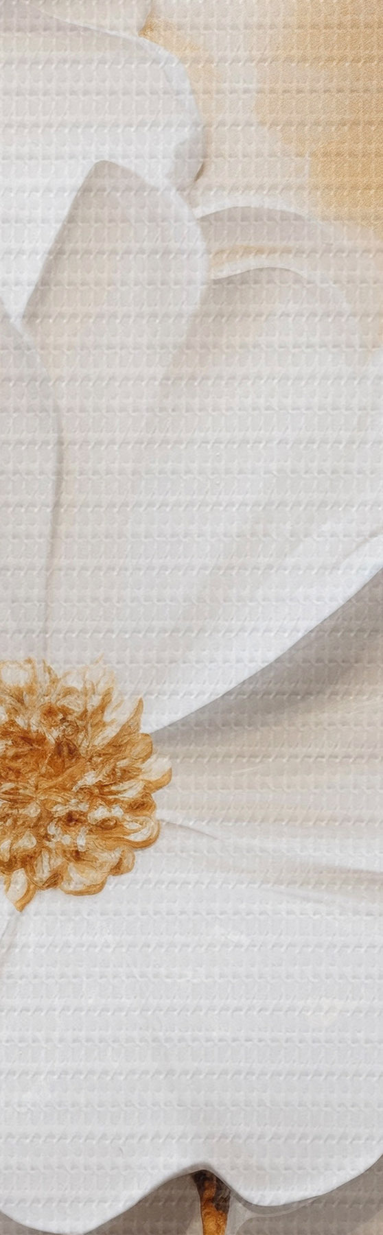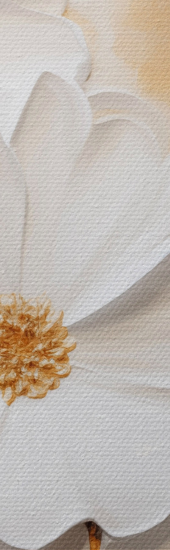 Paveikslas Balta gėlė su geltonais akcentais ir subtiliais lapais ant tekstūruoto fono, šiuolaikinis menas Nr m01233