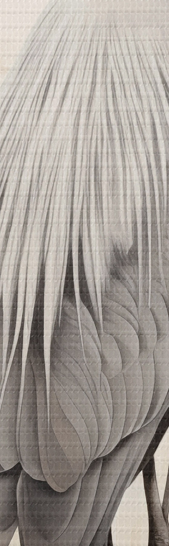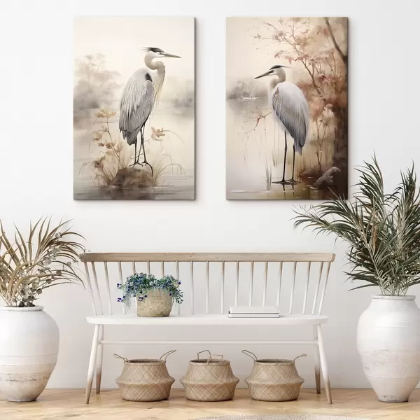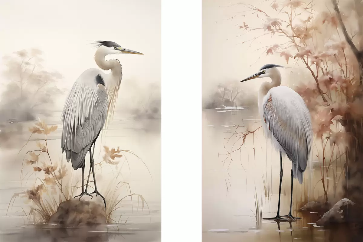 Paveikslas Gervė stovi ant uolos ežere, o fone matyti aukšti žolynai ir medžiai. Nr m01239