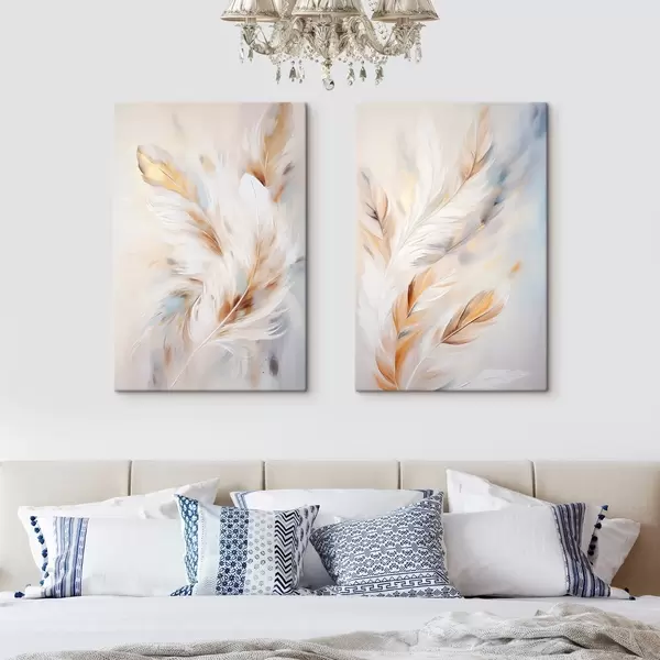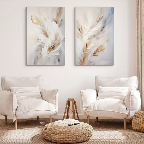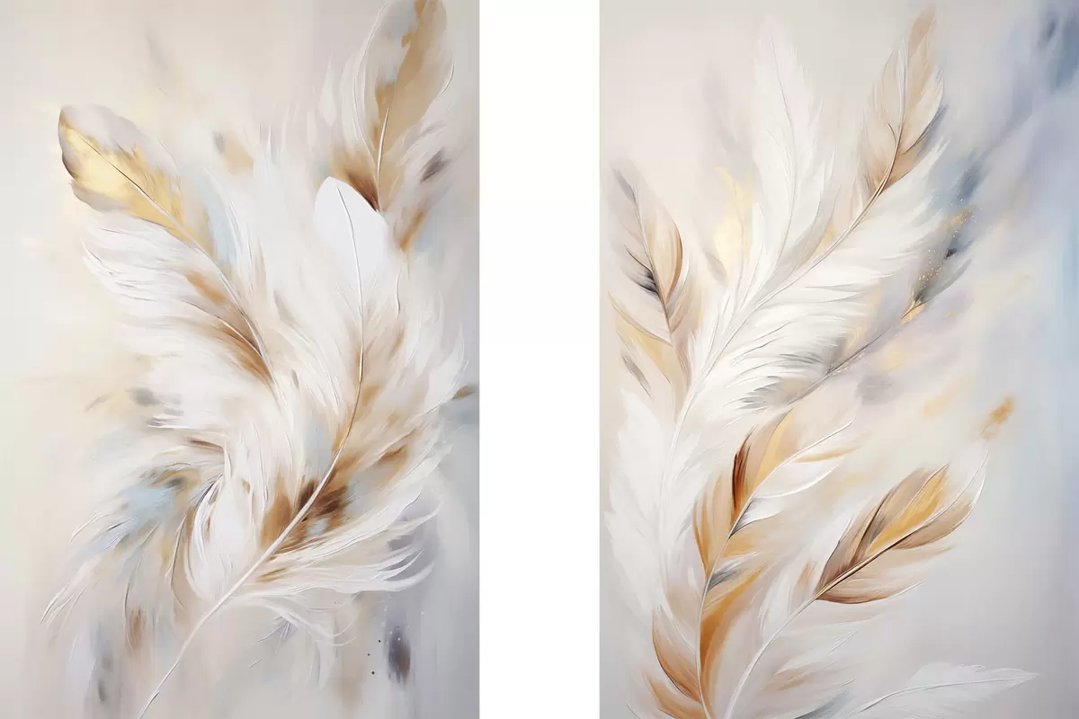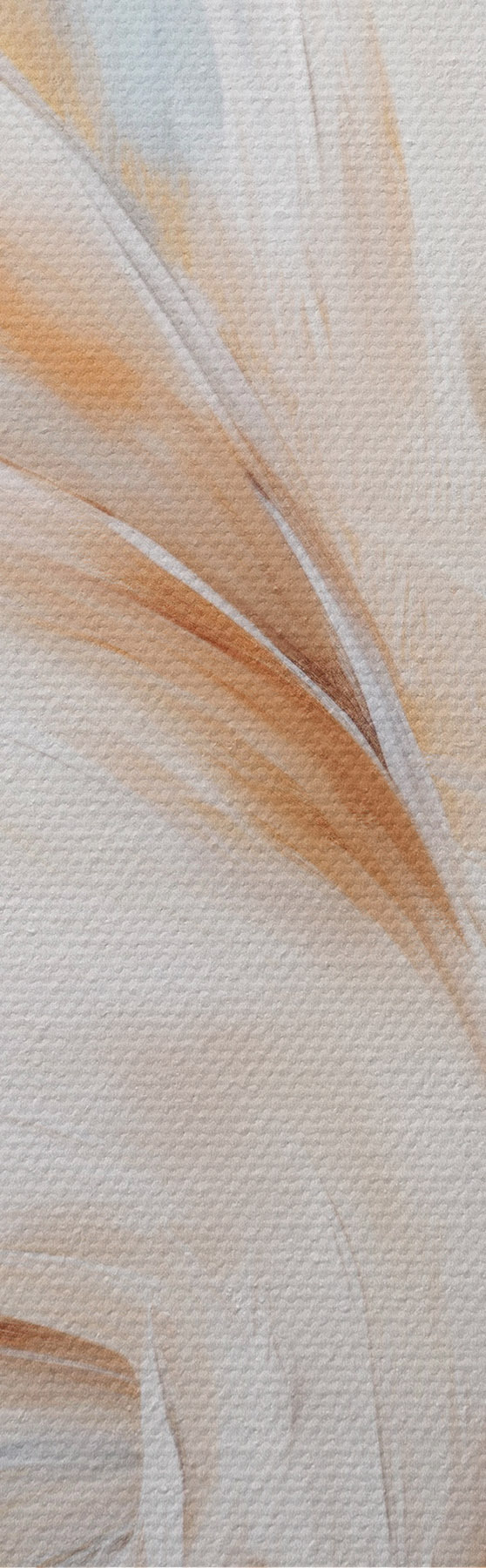Paveikslas Didelės, minkštos plunksnos, kuriose susipina balti, geltoni ir rudi atspalviai, prieš šviesų, abstraktų foną. Nr m01247