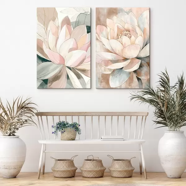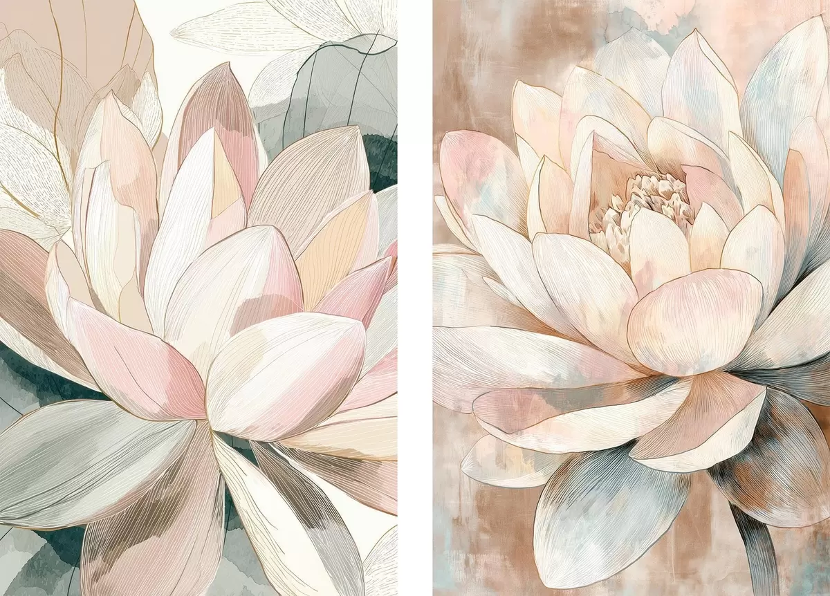 Paveikslas Gėlių kompozicija su dideliais lotosais pastelinių koralų spalvų paletėje Nr m30034