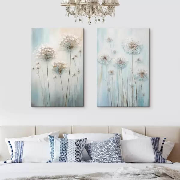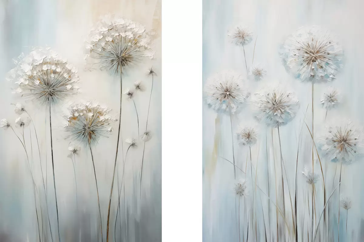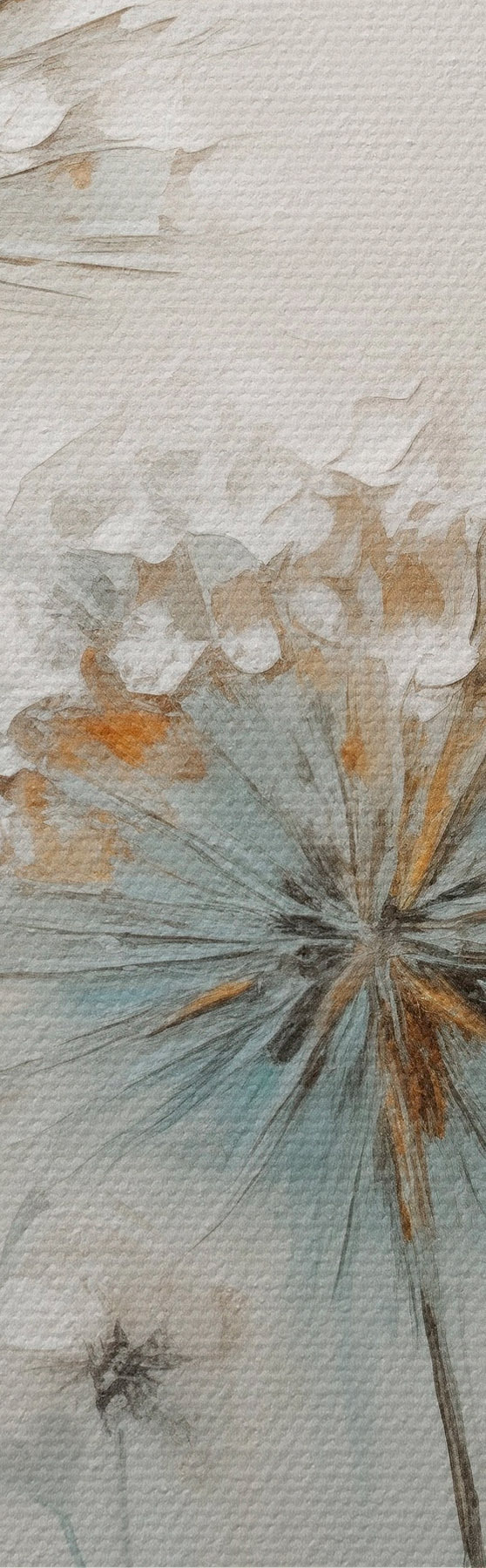 Paveikslas Tekstūrinis tapybos stilius, vaizduojantis kiaulpienes ant švelnaus mėlyno ir balto fono Nr m30048