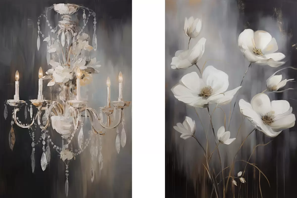 Paveikslas Abstraktus puošnus šviestuvas su degančiomis žvakėmis ir gėlių motyvais, tamsaus, tekstūruoto fono fone Nr m30049