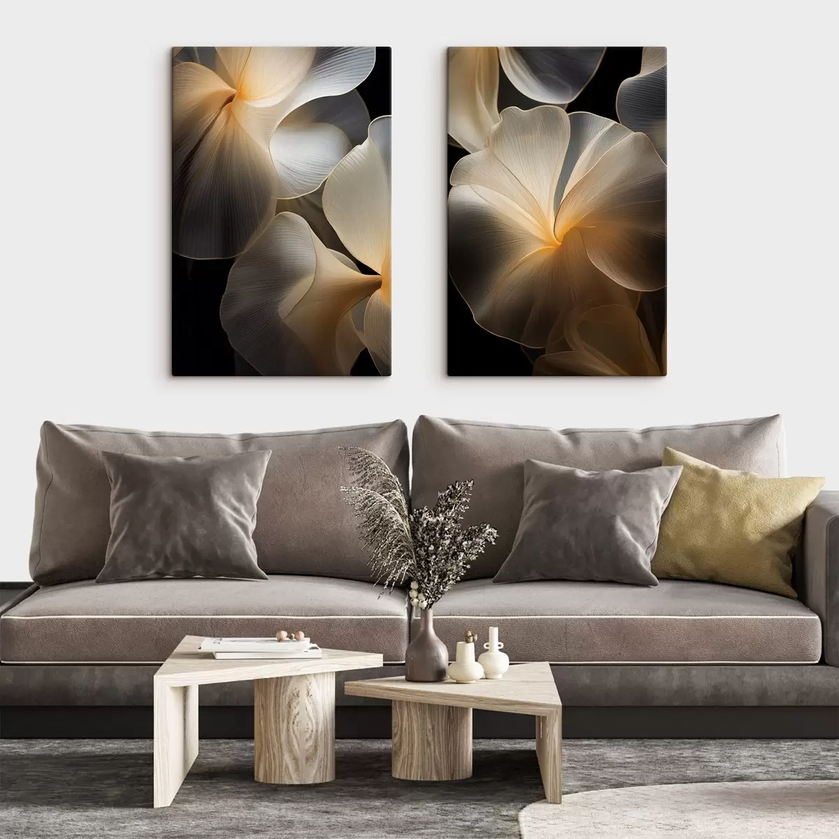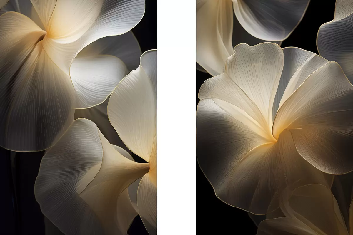 Paveikslas Abstrakčios, permatomos žiedlapių formos figūros su subtiliais kontūrais, kontrastuojančios su tamsiu fonu. Nr m30050