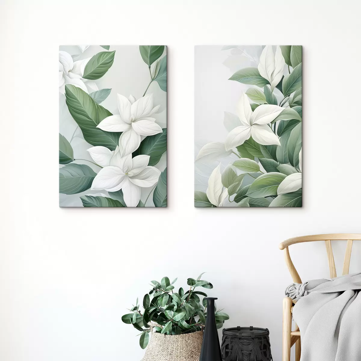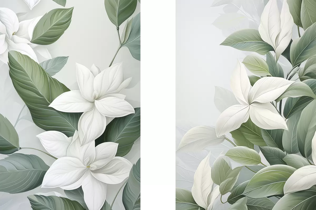 Paveikslas Balta gėlė su žaliais lapais, pastelinis fonas Nr m30055