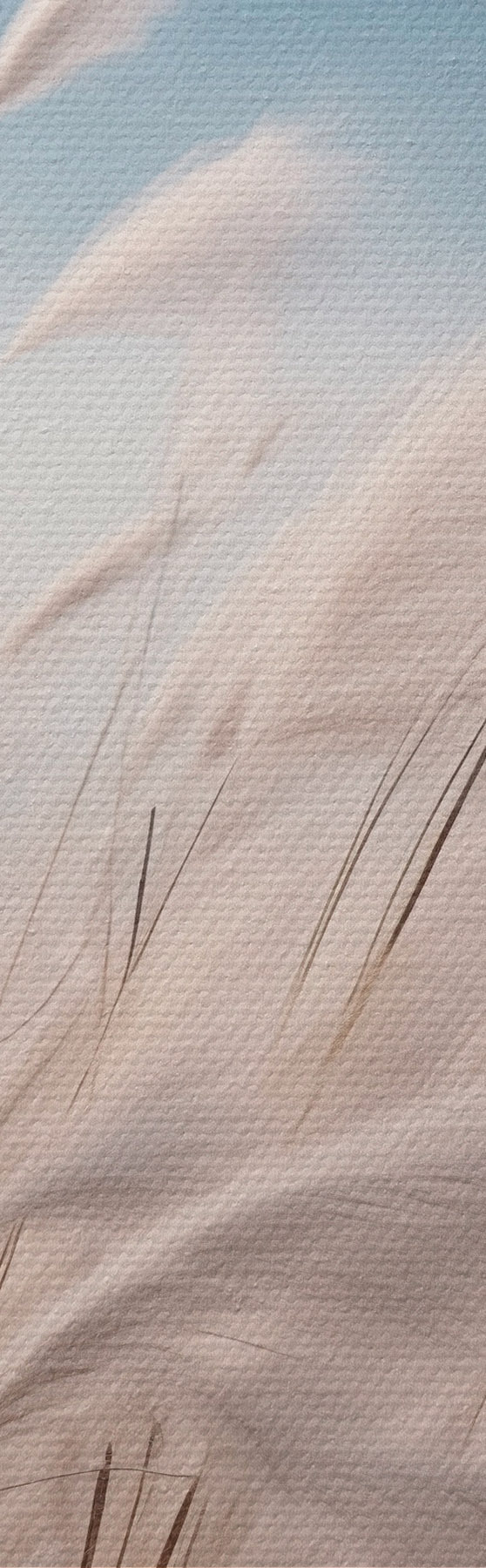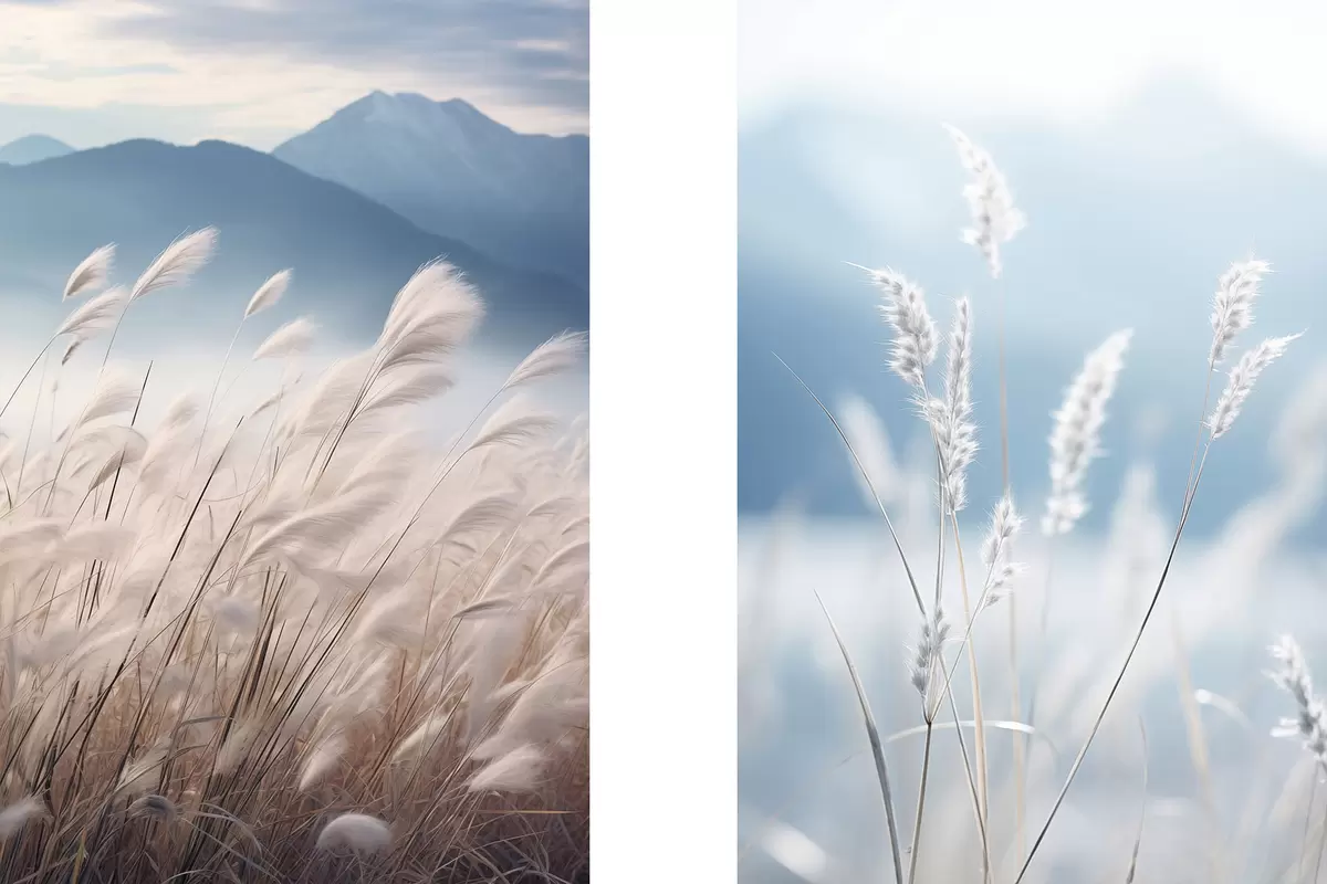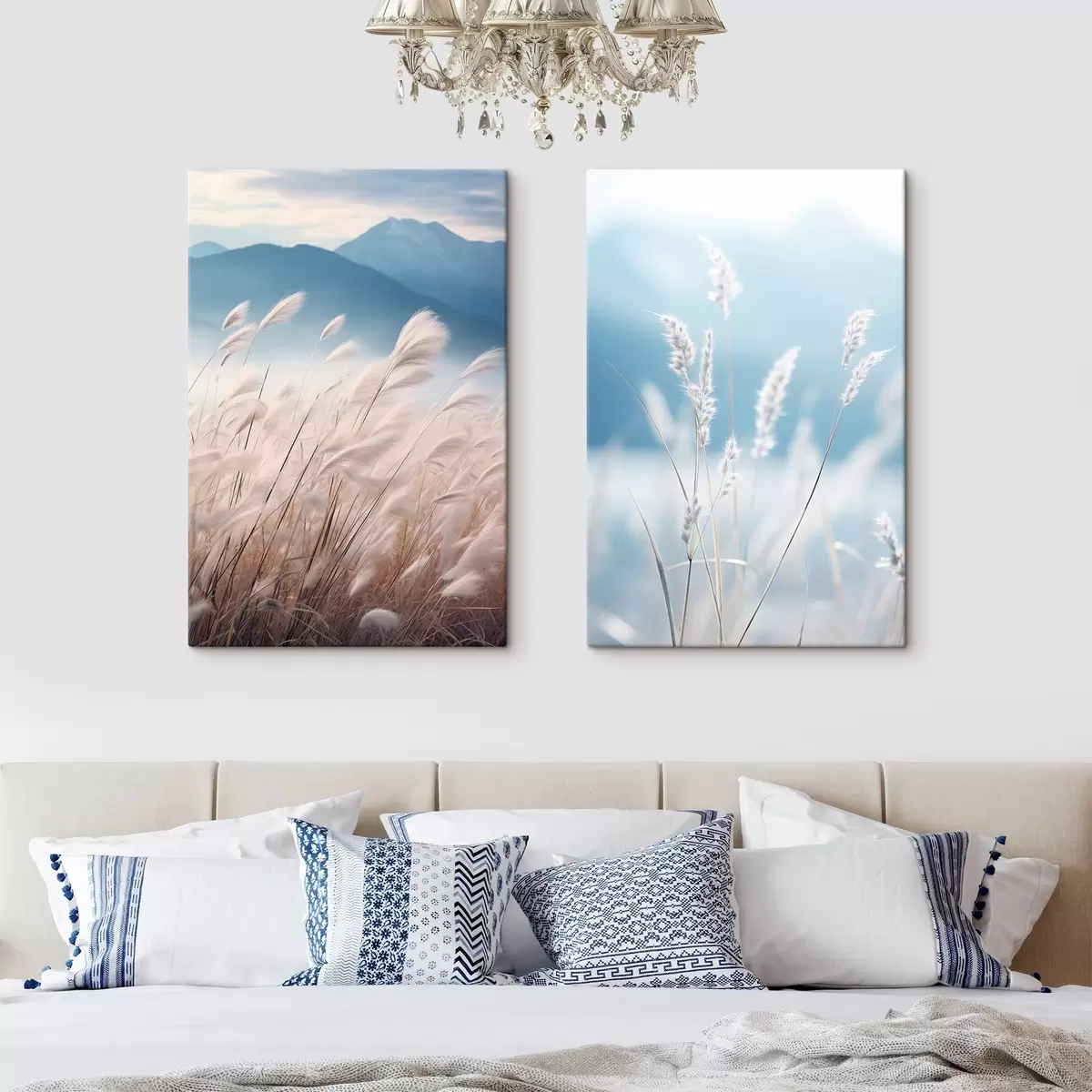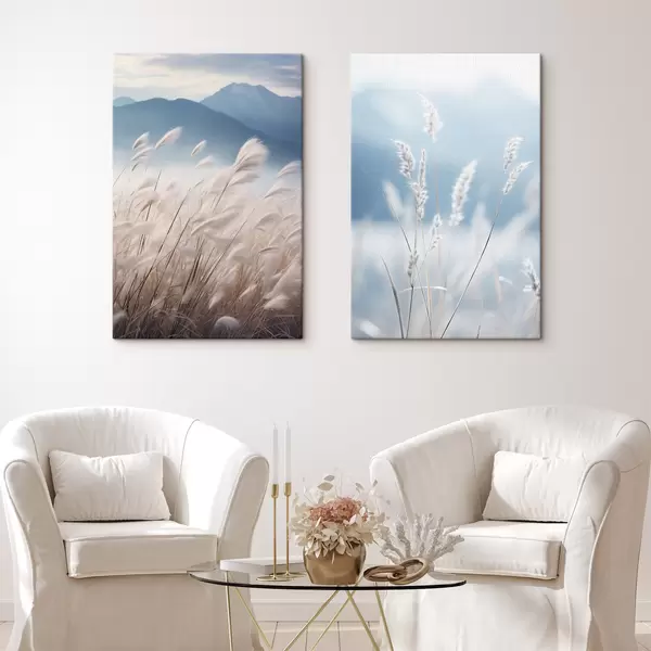 Paveikslas Aukšta, balta pampų žolė, plazdenanti vėjyje, o fone matyti švelnios mėlynos kalvos. Nr m30060