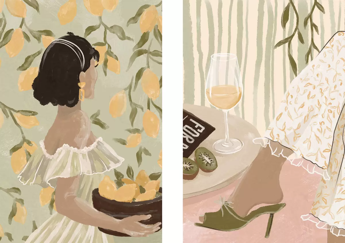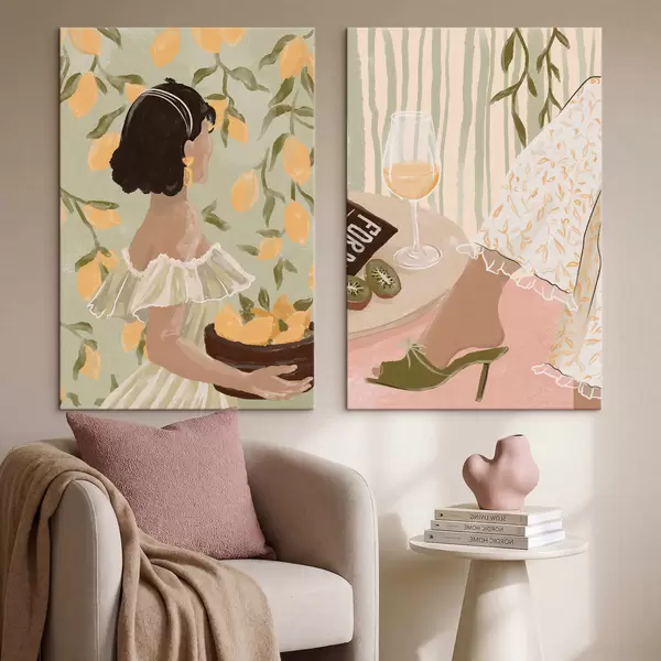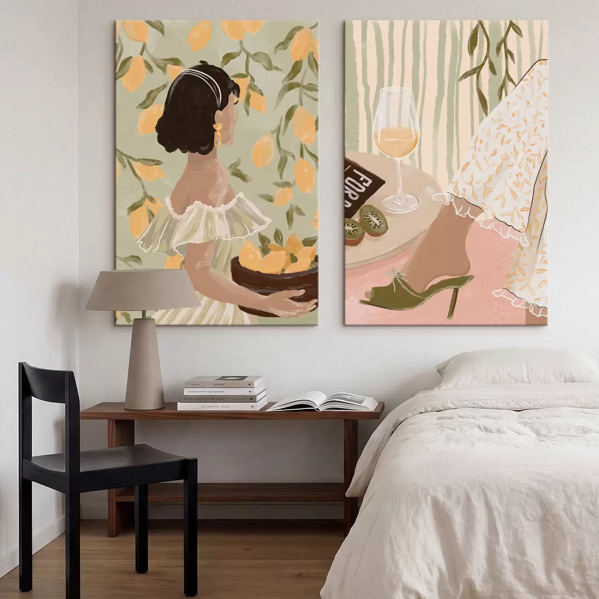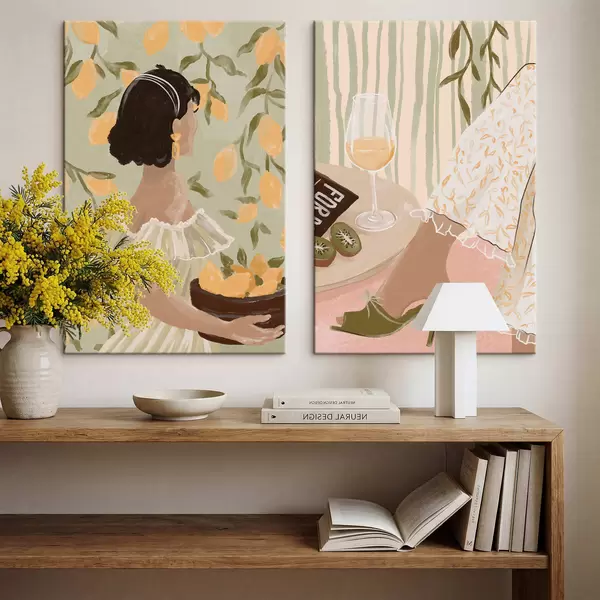 Paveikslas Moteris su citrinomis ir stalas su stikline Nr m30104