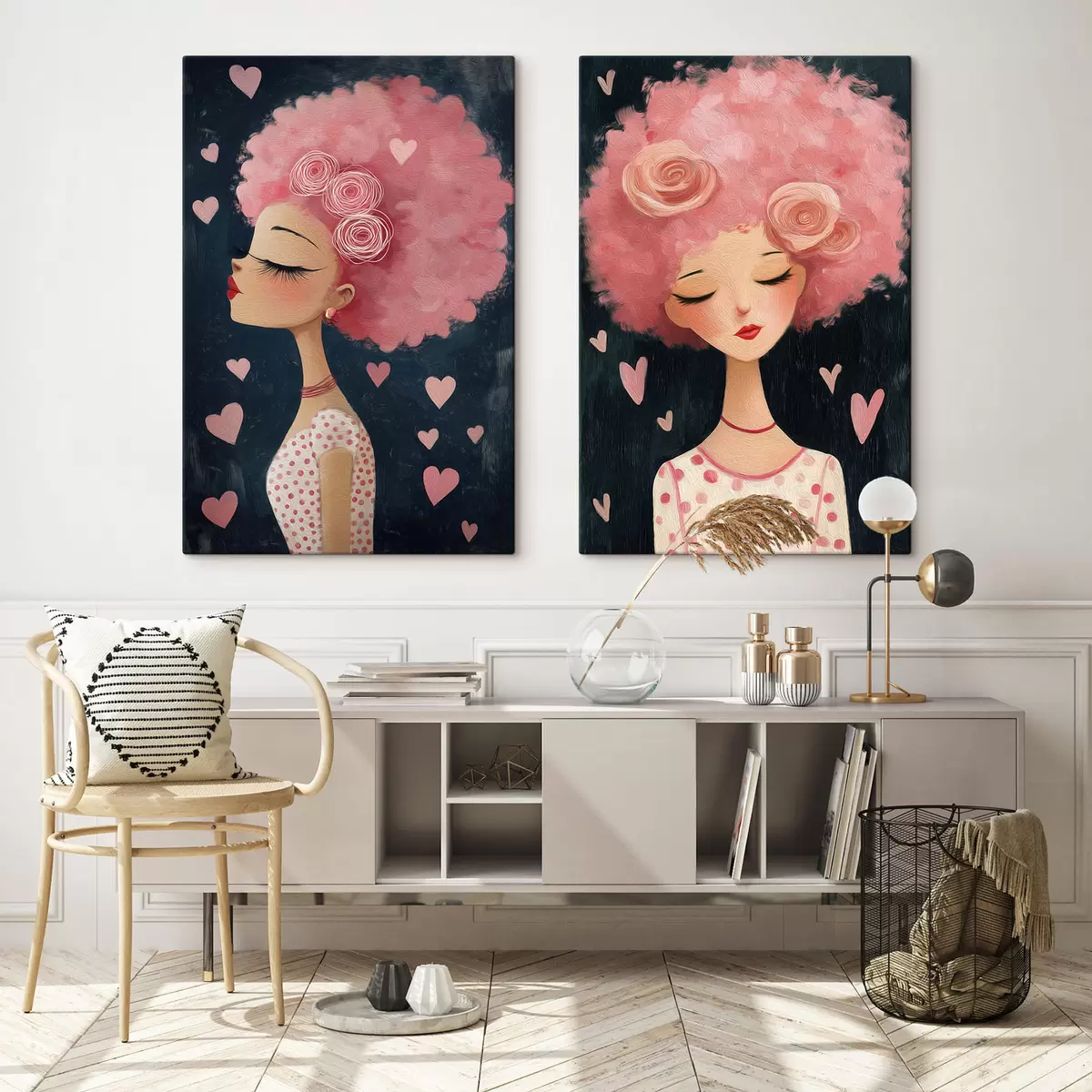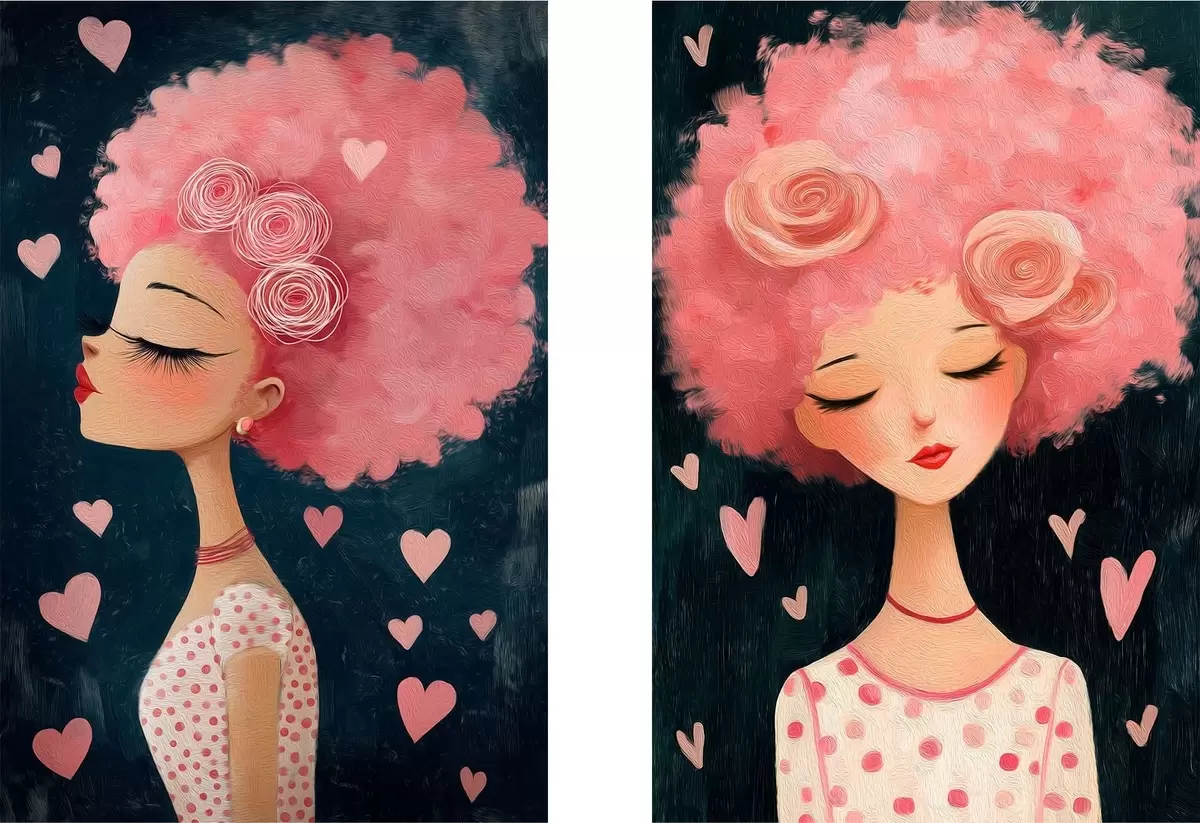 Paveikslas Mergina su rožiniais plaukais ir širdelėmis Nr m30156