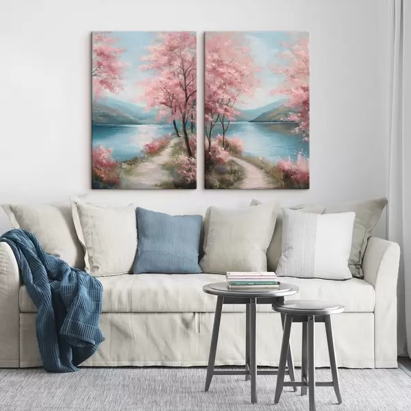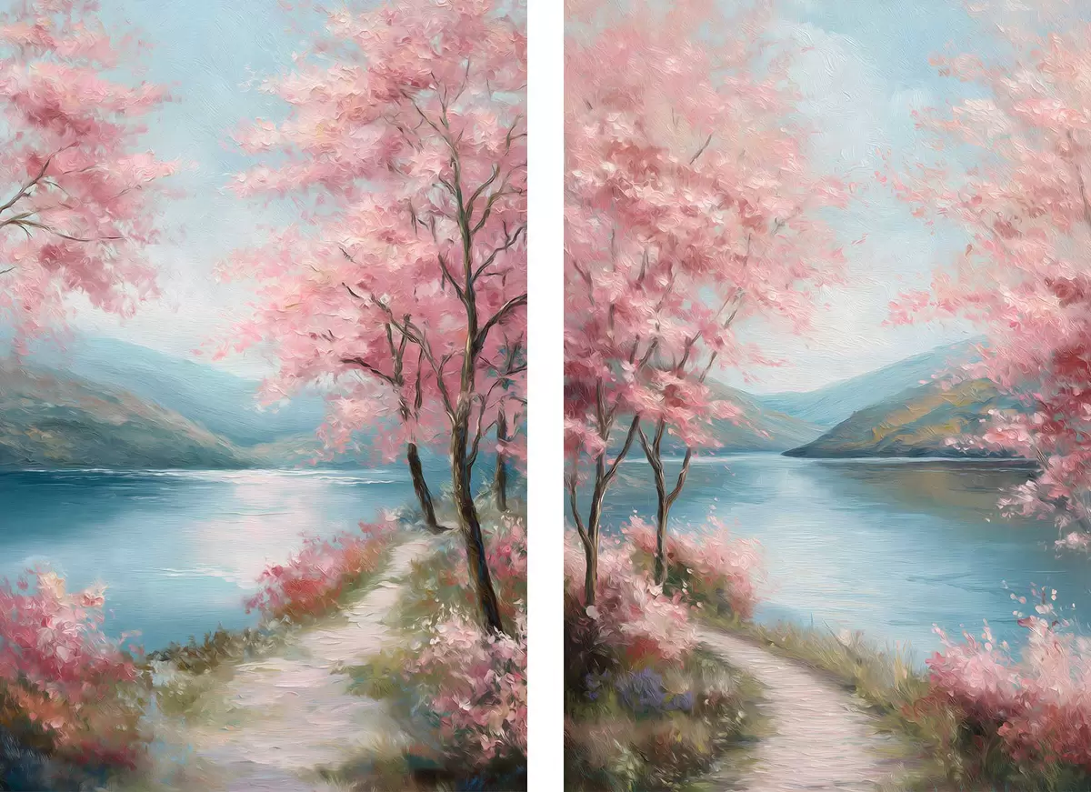 Paveikslas peizažas su rožiniais medžiais aliejaus stiliumi Nr m30176