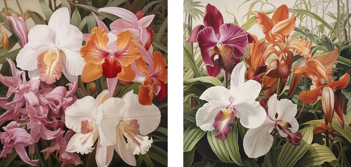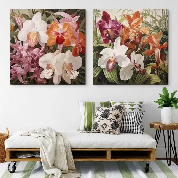Paveikslas Tropinių gėlių puokštė, orchidėjos su žaliais lapais fone Nr m30197