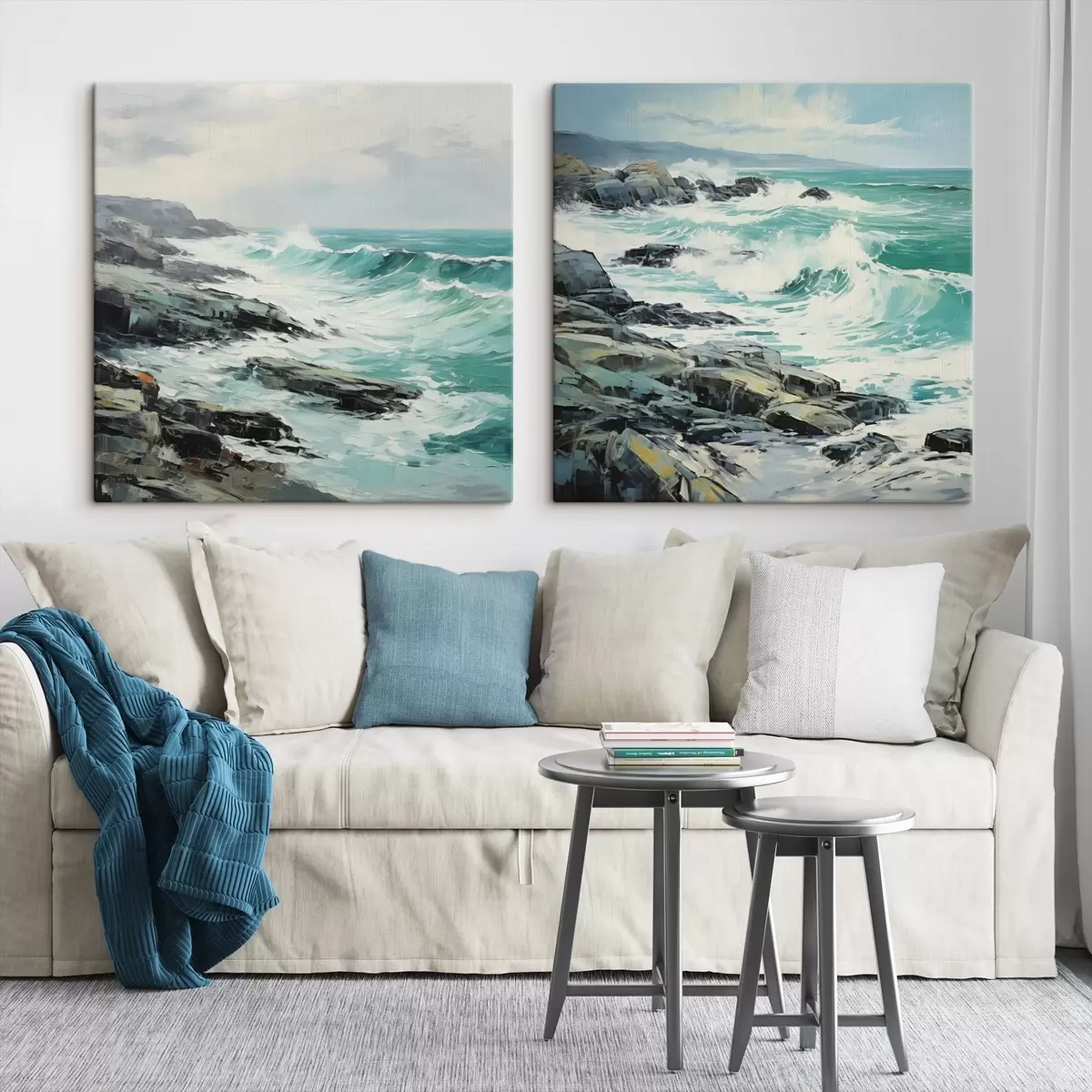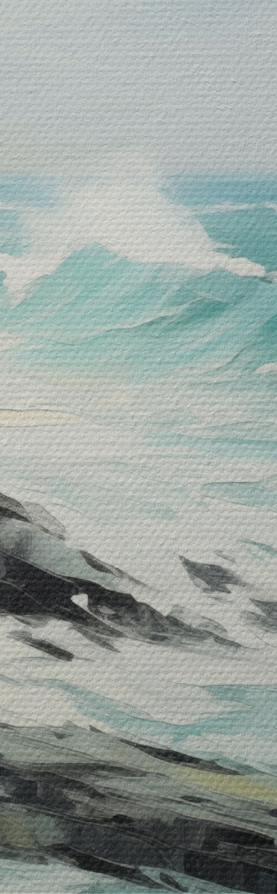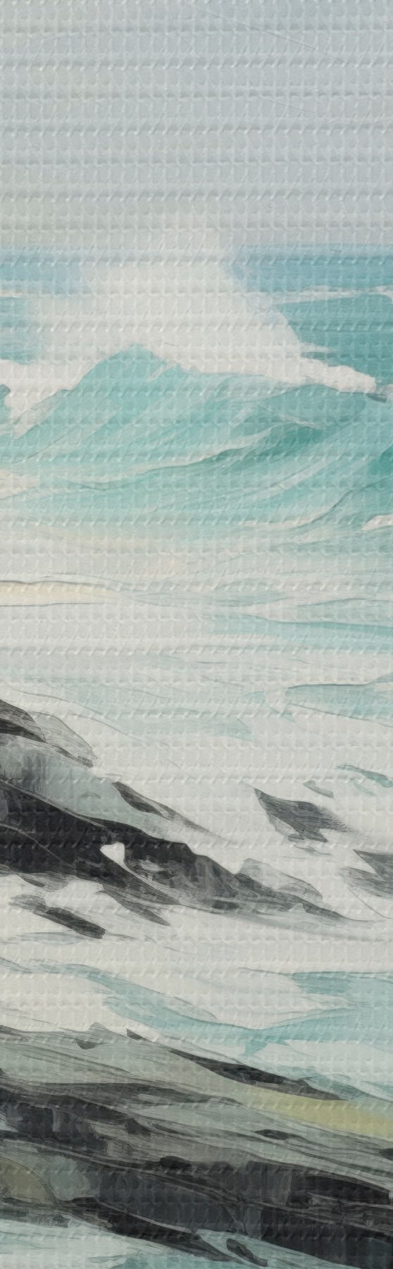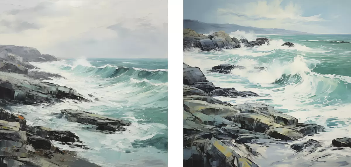 Paveikslas Uolėta pakrantės peizažas su bangomis po debesuotu dangumi, tapybos stilius Nr m30198