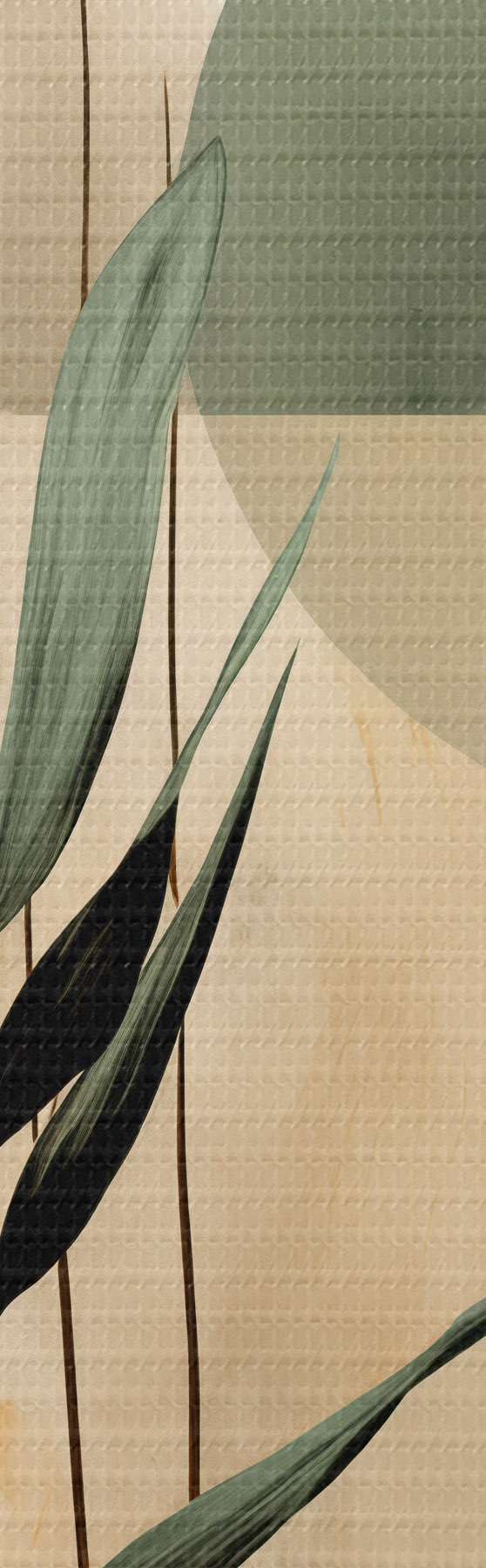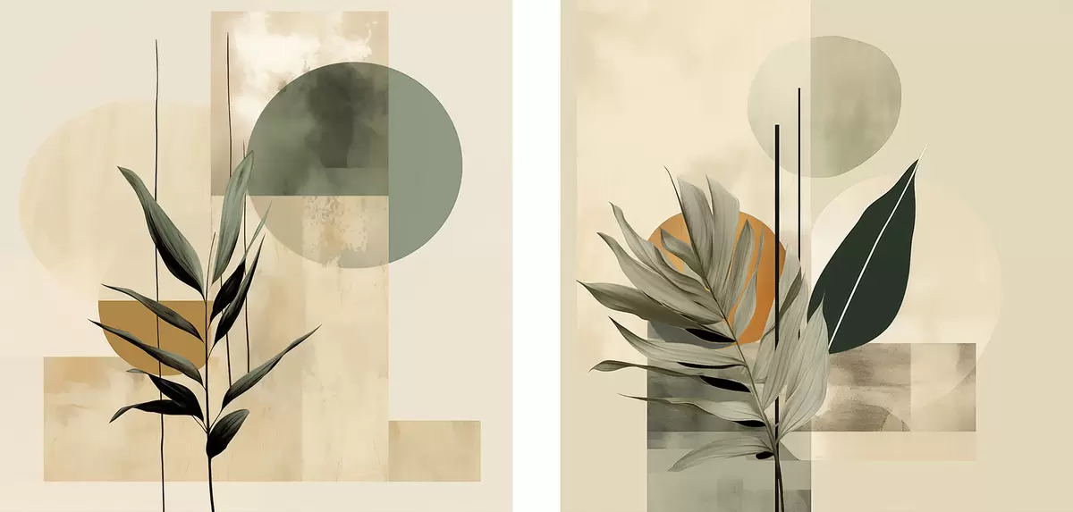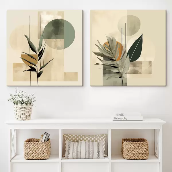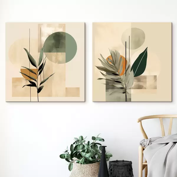 Paveikslas Tamsiai žali augalai su abstrakčiomis geometrinėmis figūromis ir akvarelinėmis tekstūromis smėlio bei žalios spalvos Nr m30209