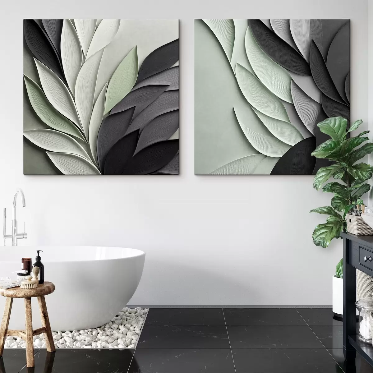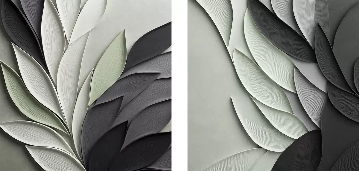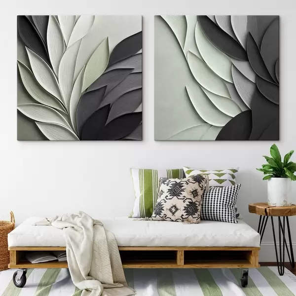 Paveikslas Abstrakčios stilizuotos lapų kompozicijos pilkos, baltos ir prislopintos žalios spalvų atspalviais Nr m30210