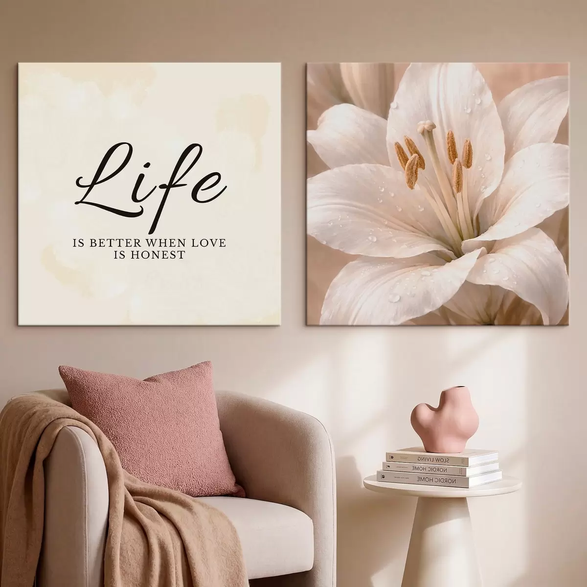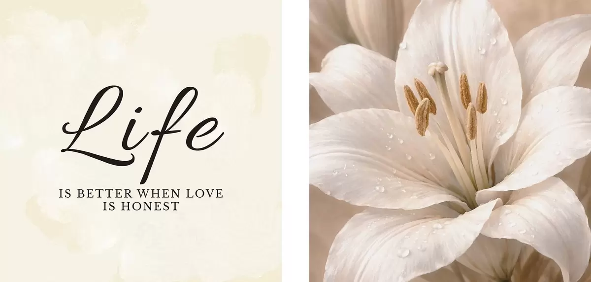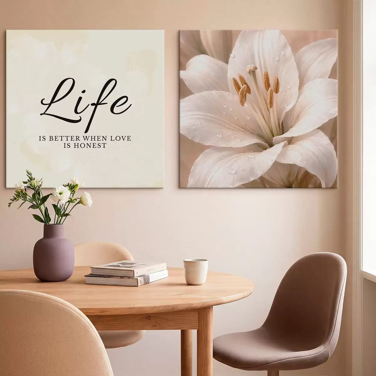 Paveikslas Diptikas su užrašu „Gyvenimas“ ir baltos gėlės artimu planu Nr m30237