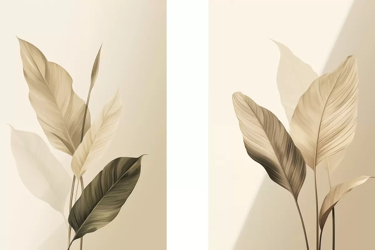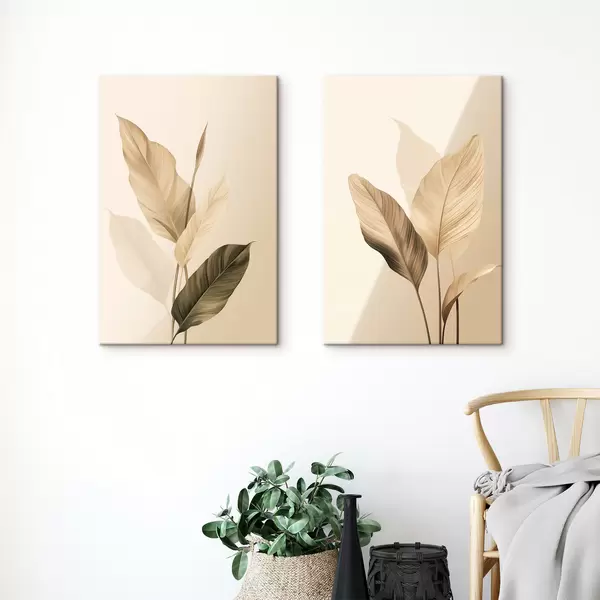 Paveikslas Dideliai tropiniai lapai smėlio ir rudos spalvų atspalviais, šviesus fonas Nr m30313