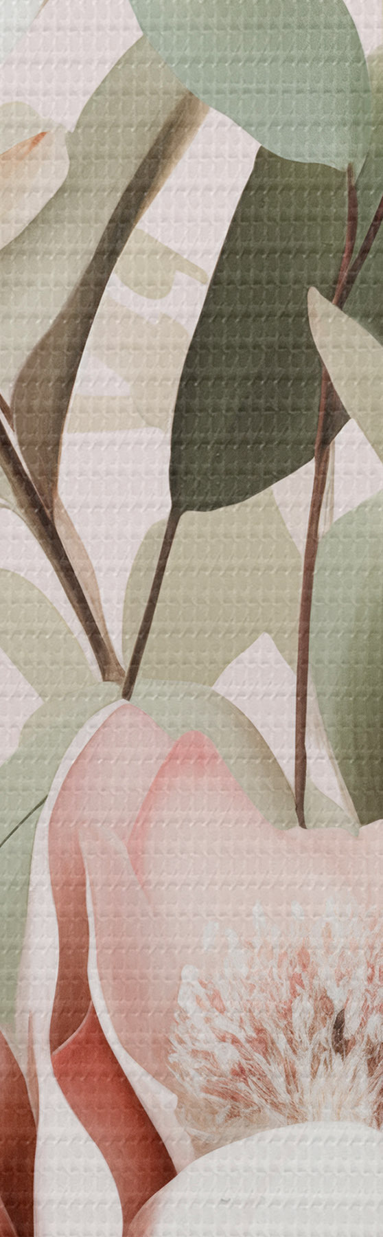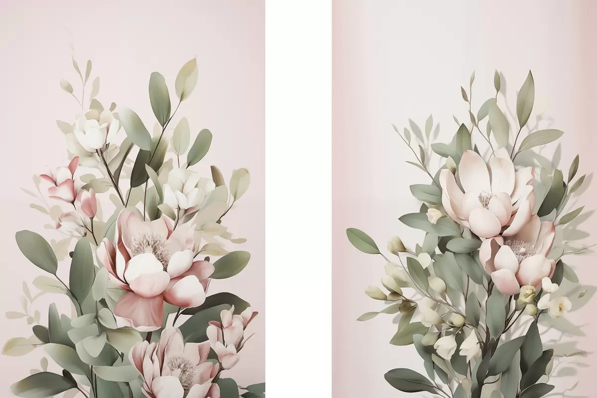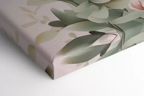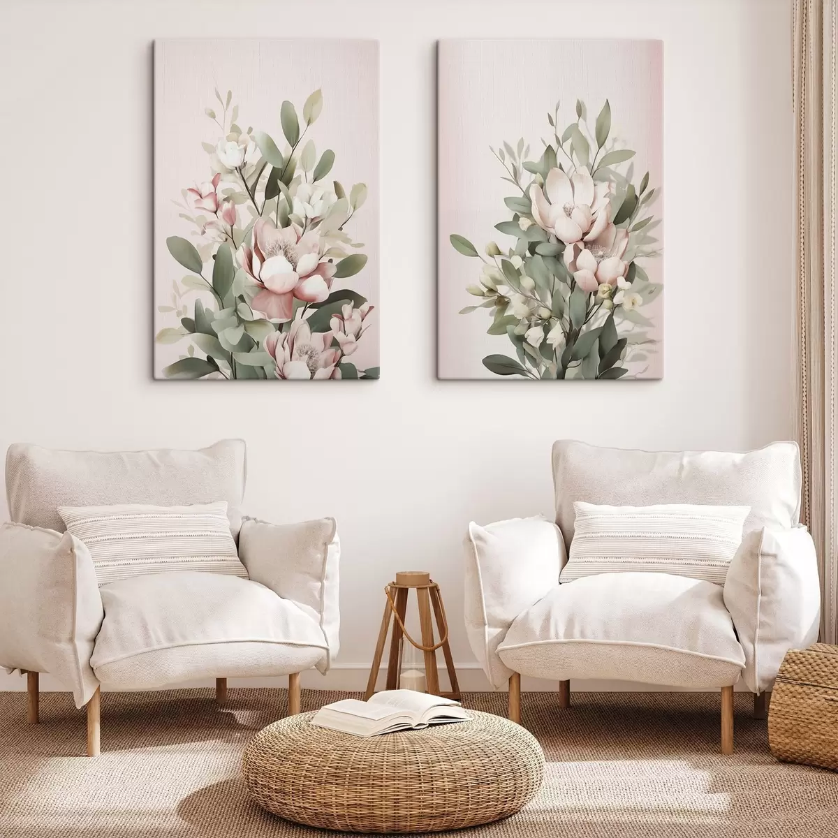 Paveikslas Pastelinių gėlių puokštė su eukalipto lapais, šviesiai rožinis fonas Nr m30314