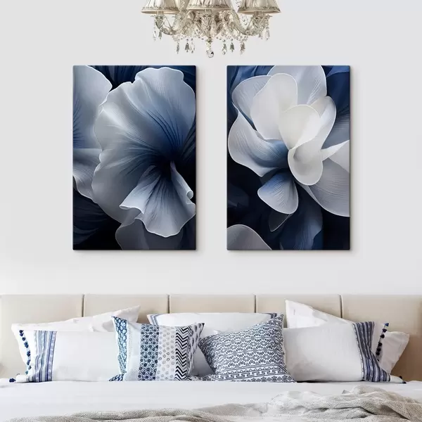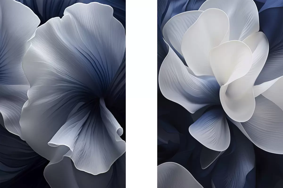 Paveikslas Abstrakčios mėlynos ir baltos gėlių žiedlapių kompozicija tamsaus fono fone Nr m30316