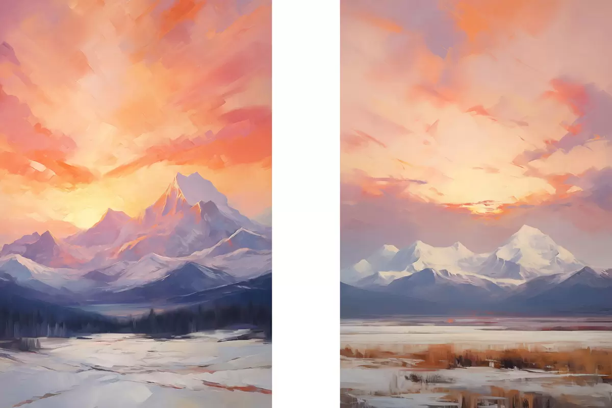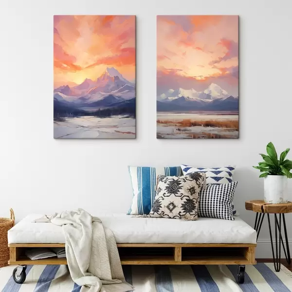 Paveikslas Sniegu padengtos kalvos po ryškiai oranžiniu ir rausvu dangumi su debesimis Nr m30321