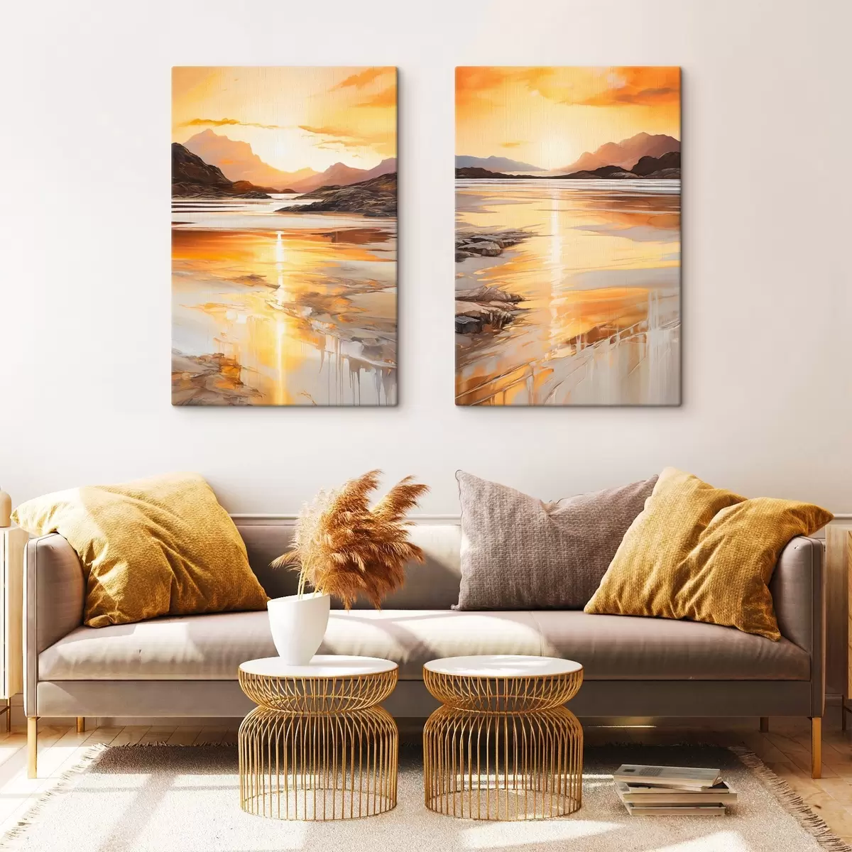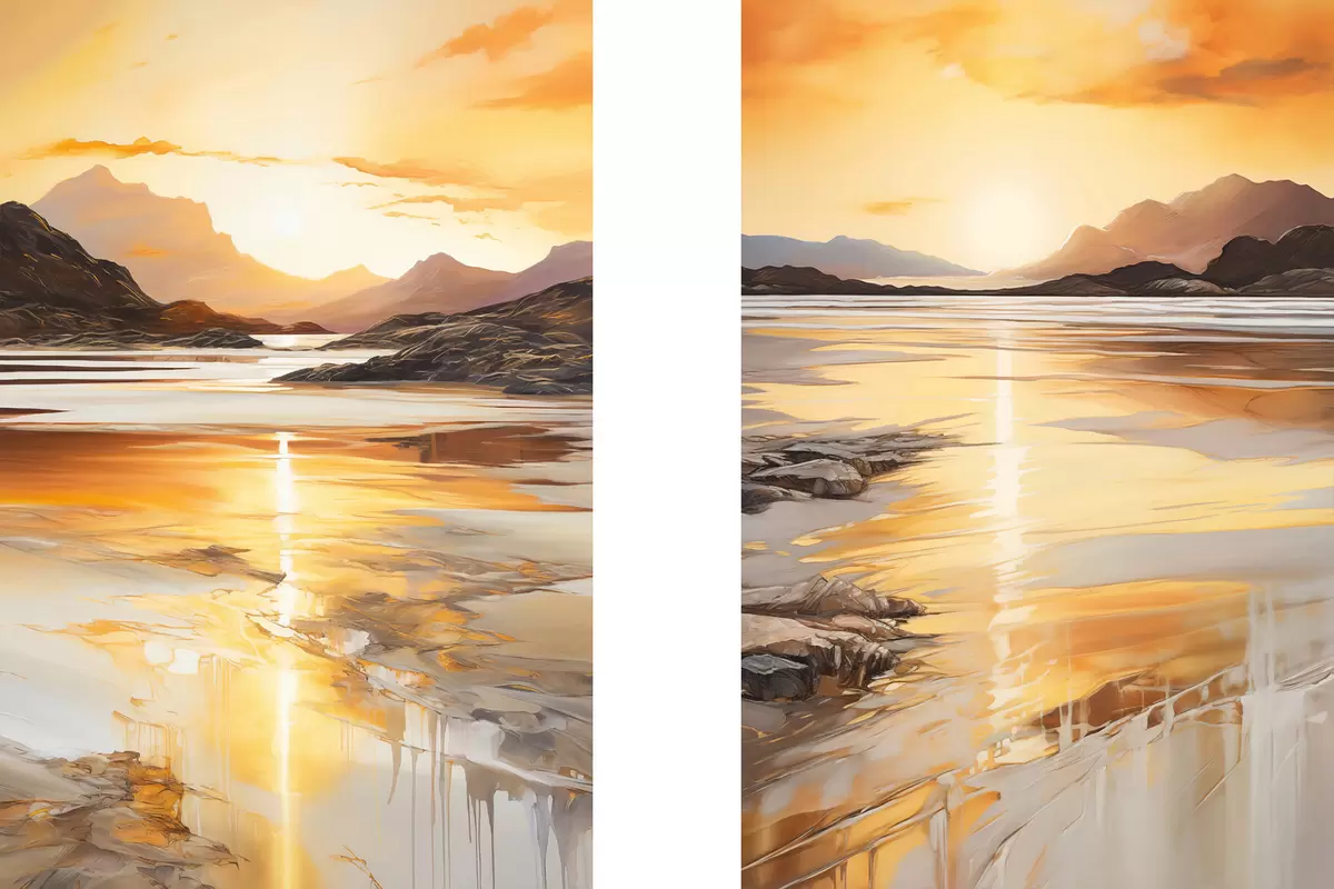 Paveikslas Peizažas su upe ir kalnais po šiltu oranžiniu dangumi, saulėlydis Nr m30328