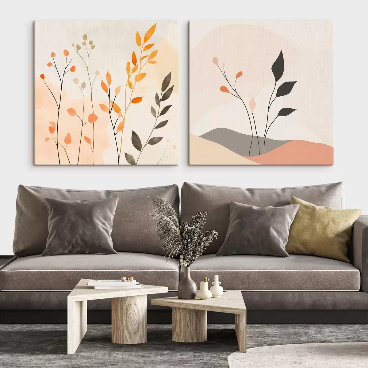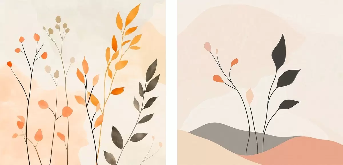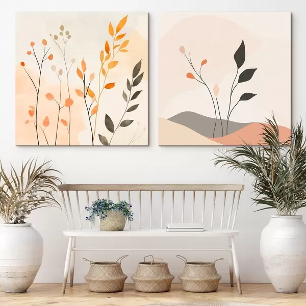 Paveikslas Gėlių diptikas šiltų smėlio ir koralų atspalvių su grafiškomis linijomis minimalistiniu stiliumi Nr m30363