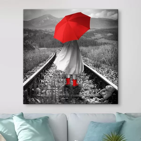 Paveikslas Žmogus su raudonu skėčiu ant traukinio bėgių Nr s37301