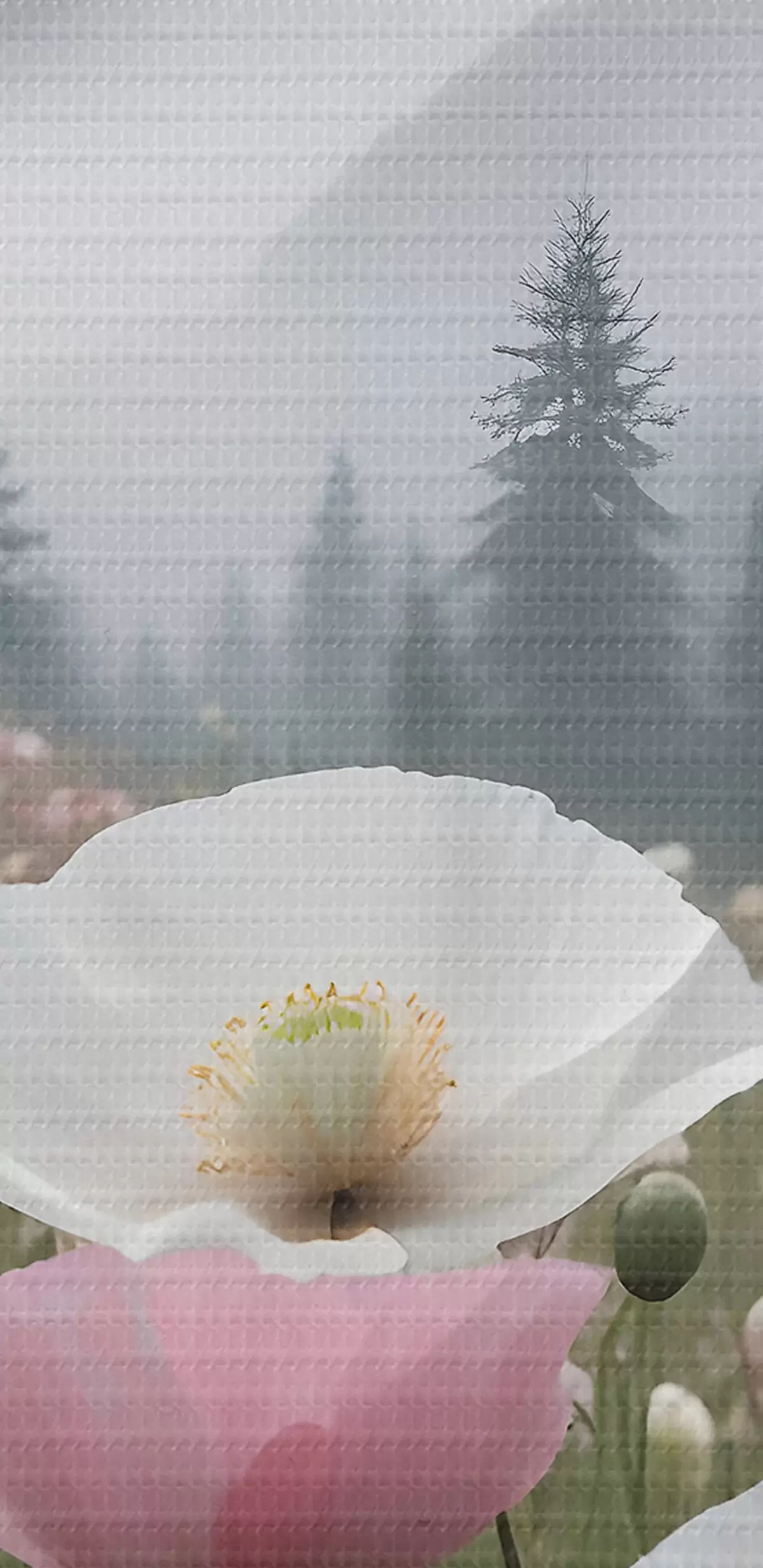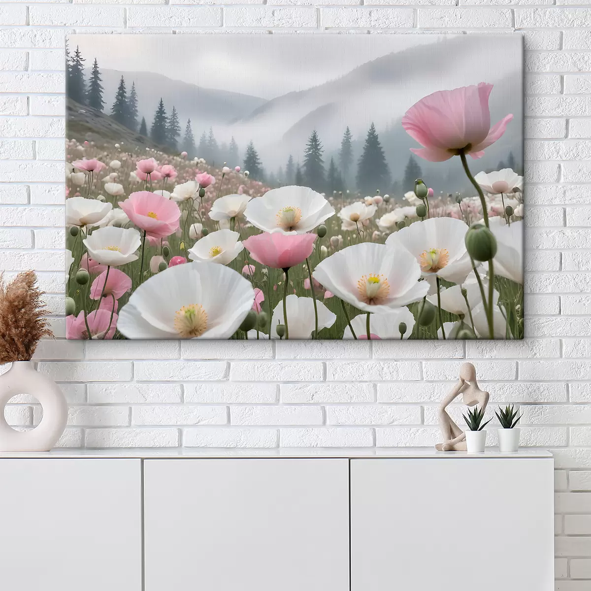 Paveikslas Rožinių ir baltų aguonų laukas kalnų peizaže fone Nr s38369