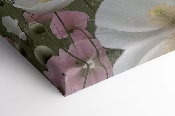 Paveikslas Rožinių ir baltų aguonų laukas kalnų peizaže fone Nr s38369